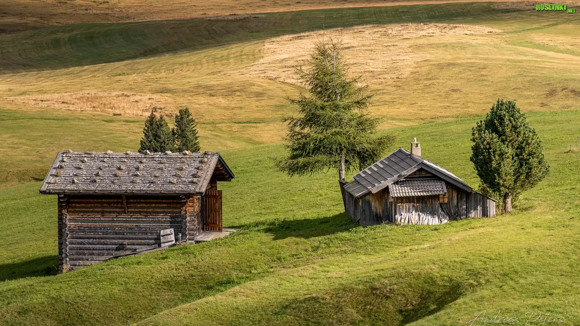 Rośliny: Płaskowyż, Seiser Alm, Dolina Val Gardena, Wzgórza, Łąki, Drewniane, Domki, Drzewa, Włochy