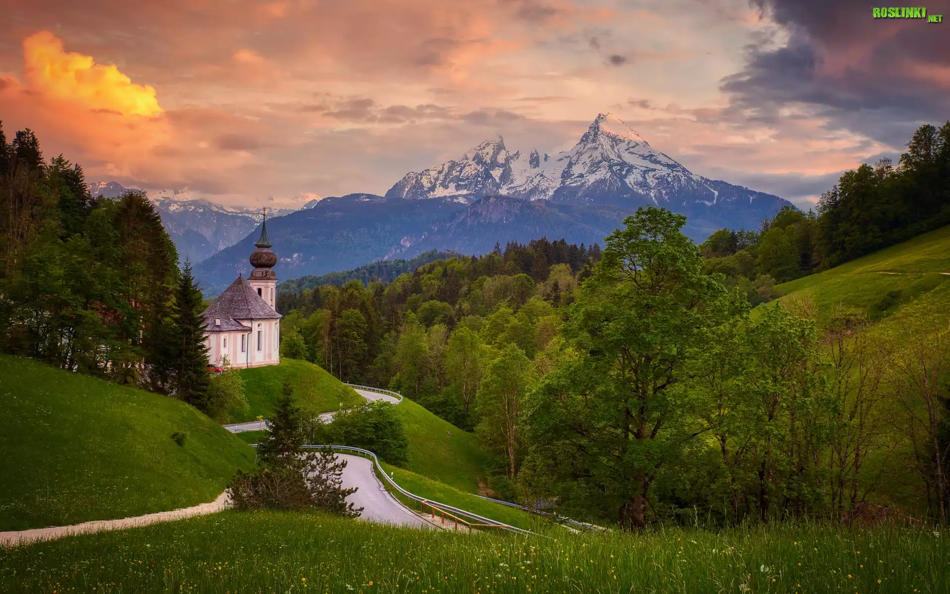 Kościół, Sanktuarium Maria Gern, Drzewa, Lasy, Droga, Góry, Alpy Salzburskie, Berchtesgaden, Bawaria, Niemcy |