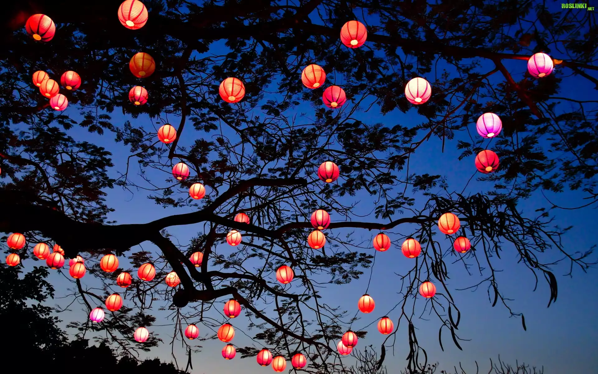 Rośliny: Girlanda, Lampki, Gałęzie, Drzewo, Noc
