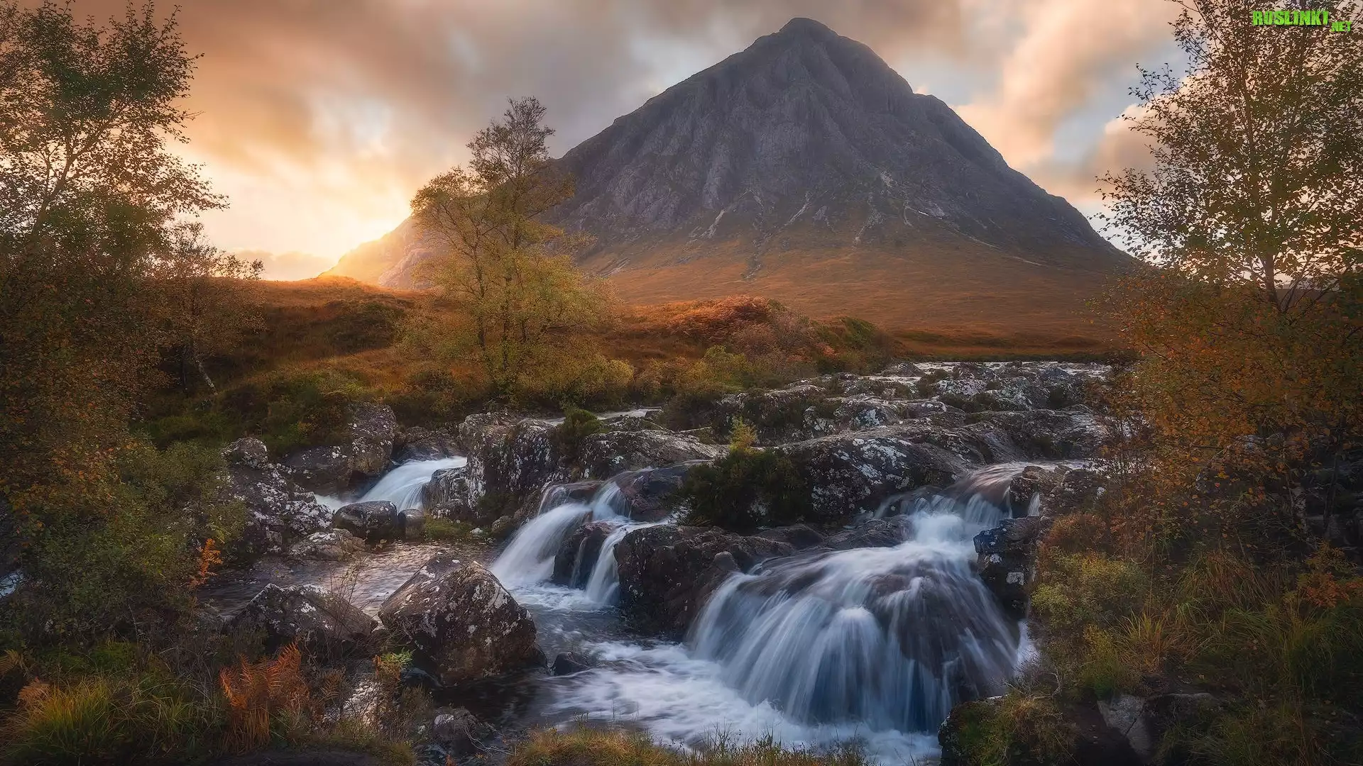 Zachód słońca, Jesień, Góra, Buachaille Etive Mor, Dolina, Glen Coe, Skały, Rzeka, Drzewa, Szkocja |