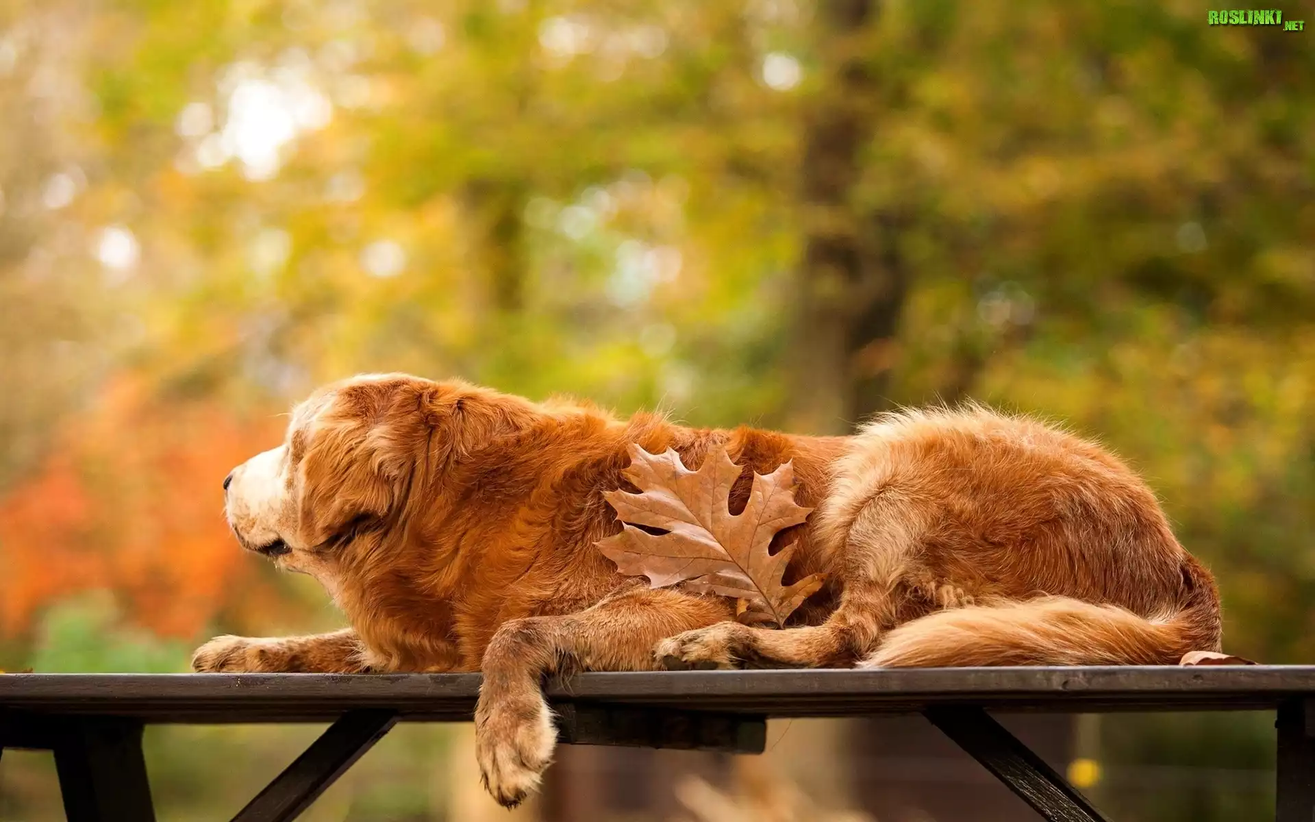 Rośliny: Golden, Retriever, Park, Ławka, Liść