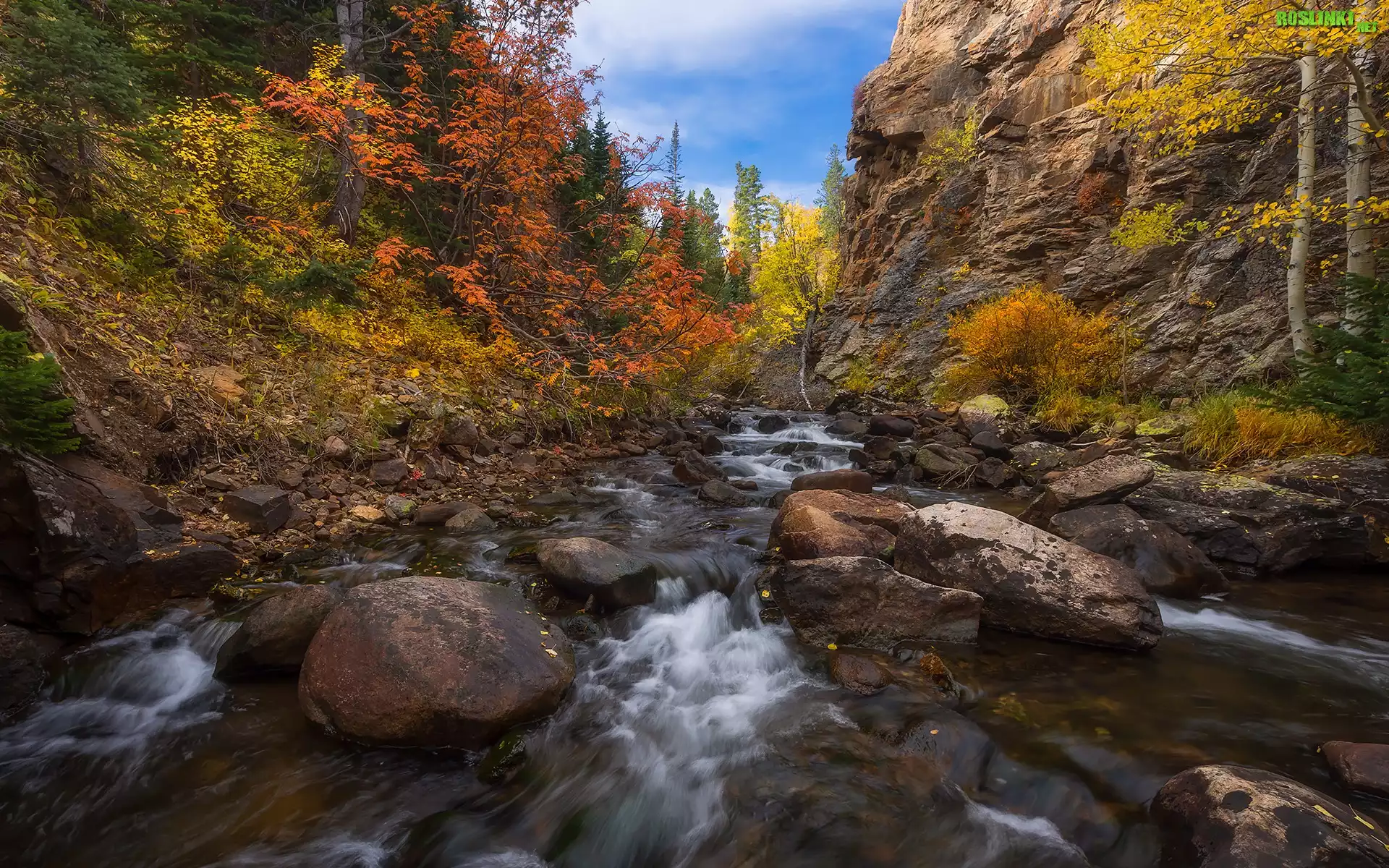 Rośliny: Potok, Kamienie, Drzewa, Jesień, Park Narodowy Gór Skalistych, Kolorado, Stany Zjednoczone