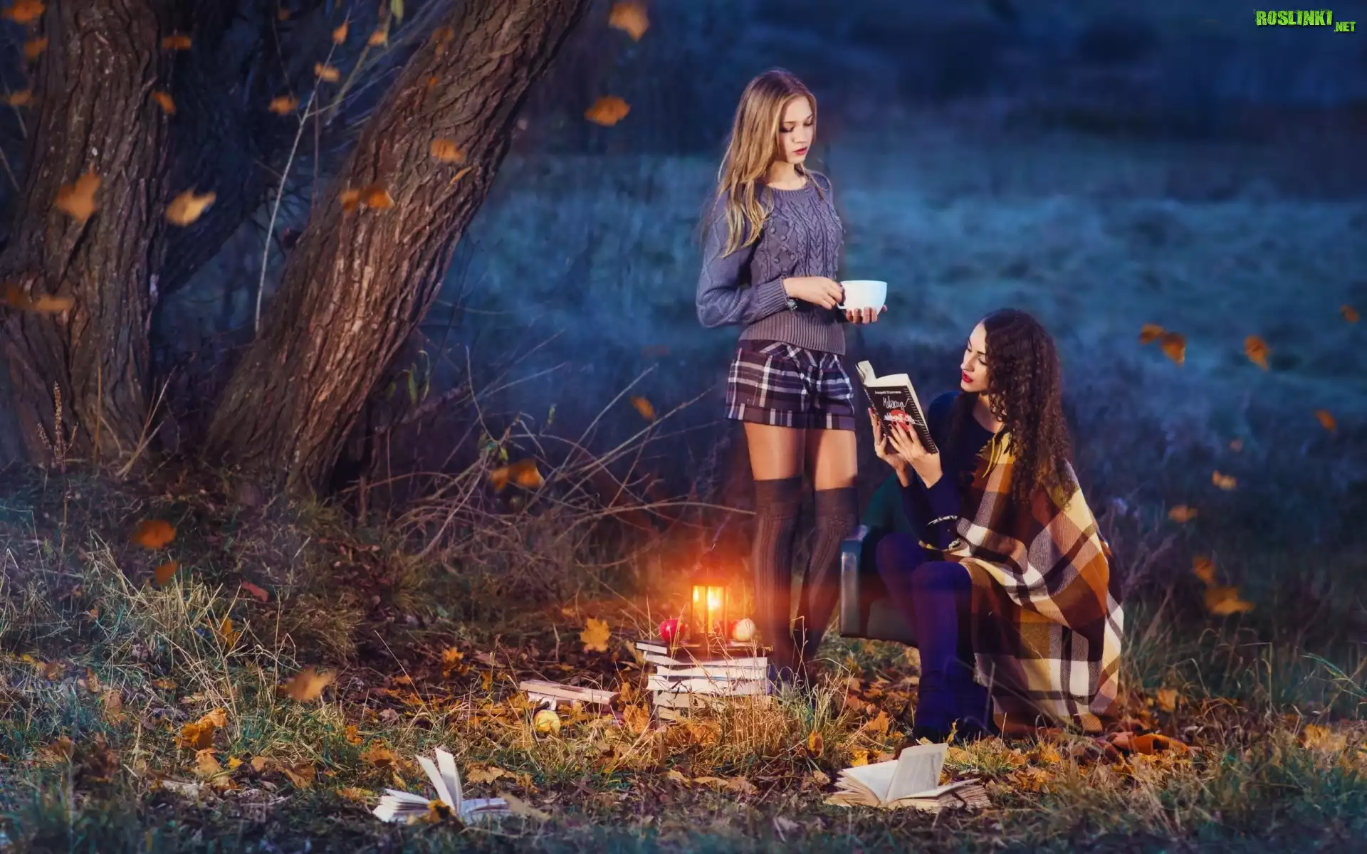 Dziewczyny, Góra, Polana, Las, Liście, Lampion, Zmrok, Jesień
