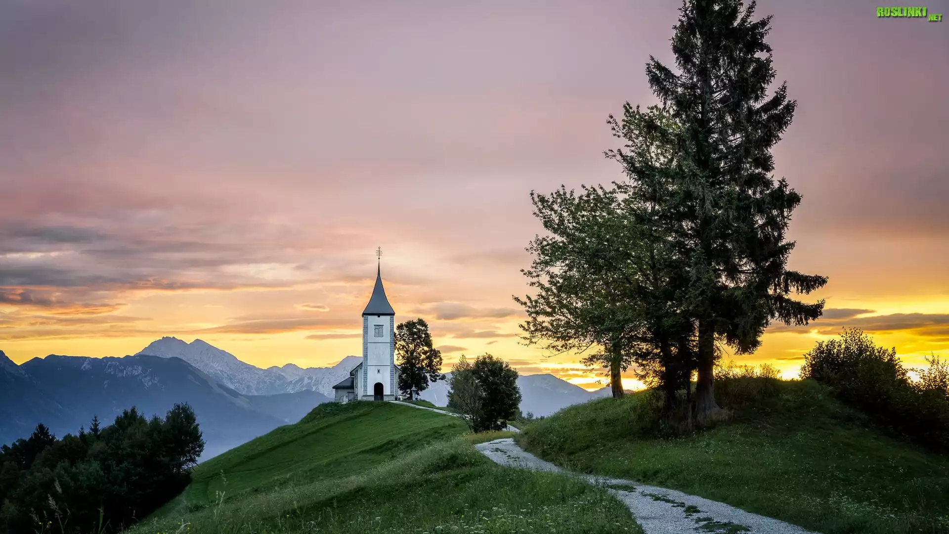 Słowenia, Wieś, Begunje na Gorenjskem, Góry, Wzgórze, Kościół św Piotra, Droga, Drzewa, Wschód słońca |