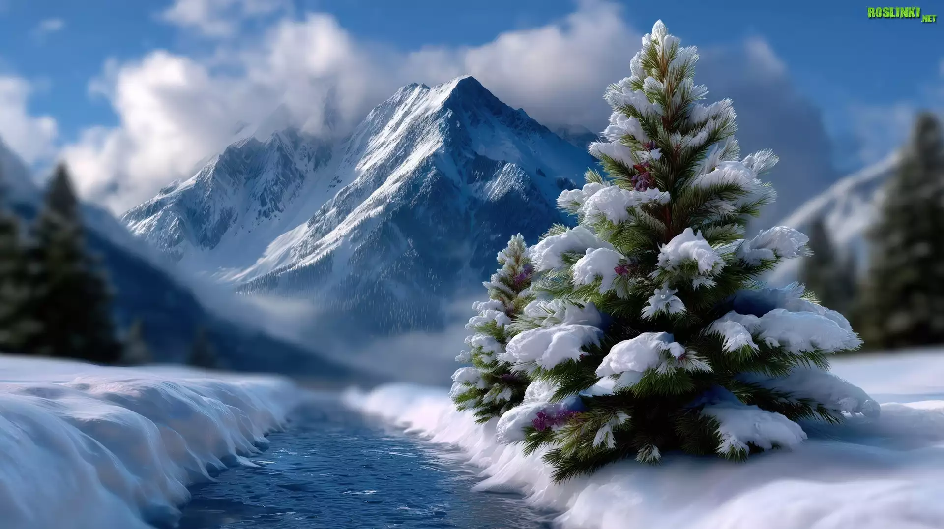 Rośliny: Zima, Rzeka, Drzewa, Góry, Grafika AI