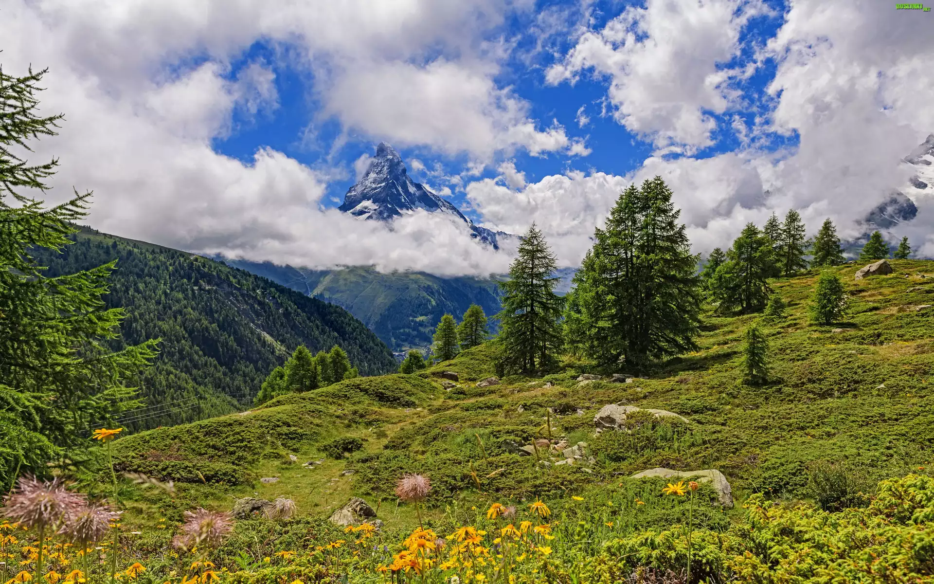 Rośliny: Góry, Szczyt, Świerki, Drzewa, Łąka, Chmury