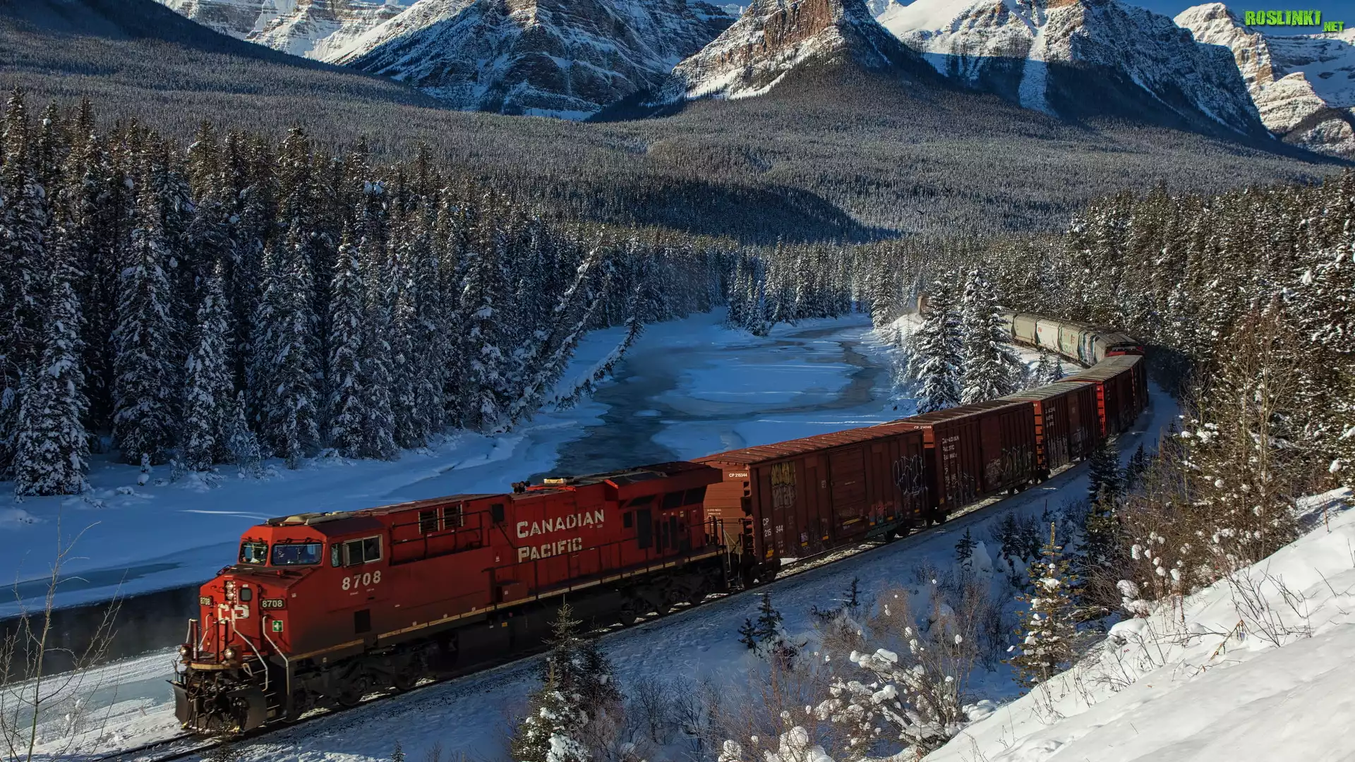 Góry Skaliste, Zima, Las, Drzewa, Rzeka, Bow River, Park Narodowy Banff, Pociąg, Chmury, Alberta, Kanada |