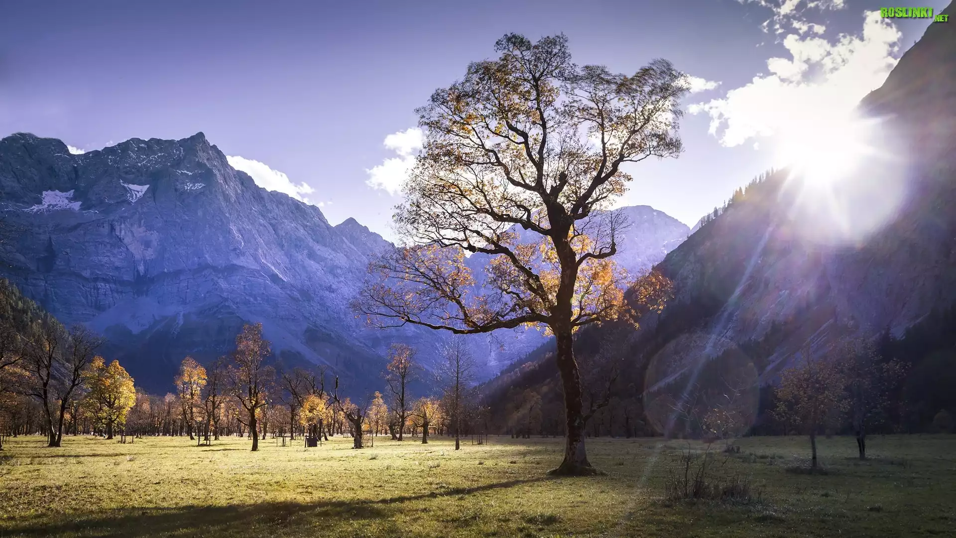 Austria, Góry Karwendel, Alpejski Park Krajobrazowy Karwendel, Dolina Rißtal, Pastwisko alpejskie Großer Ahornboden, Drzewa, Słońce, Promienie, Drzewa, Łąka |