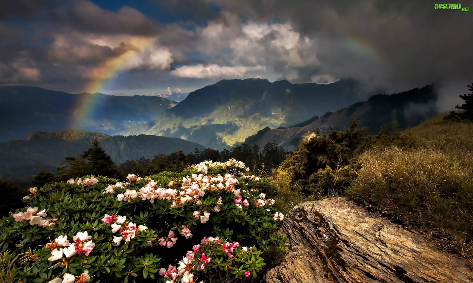 Rośliny: Góry, Lasy, Łąka, Rododendrony, Chmury, Tęcza