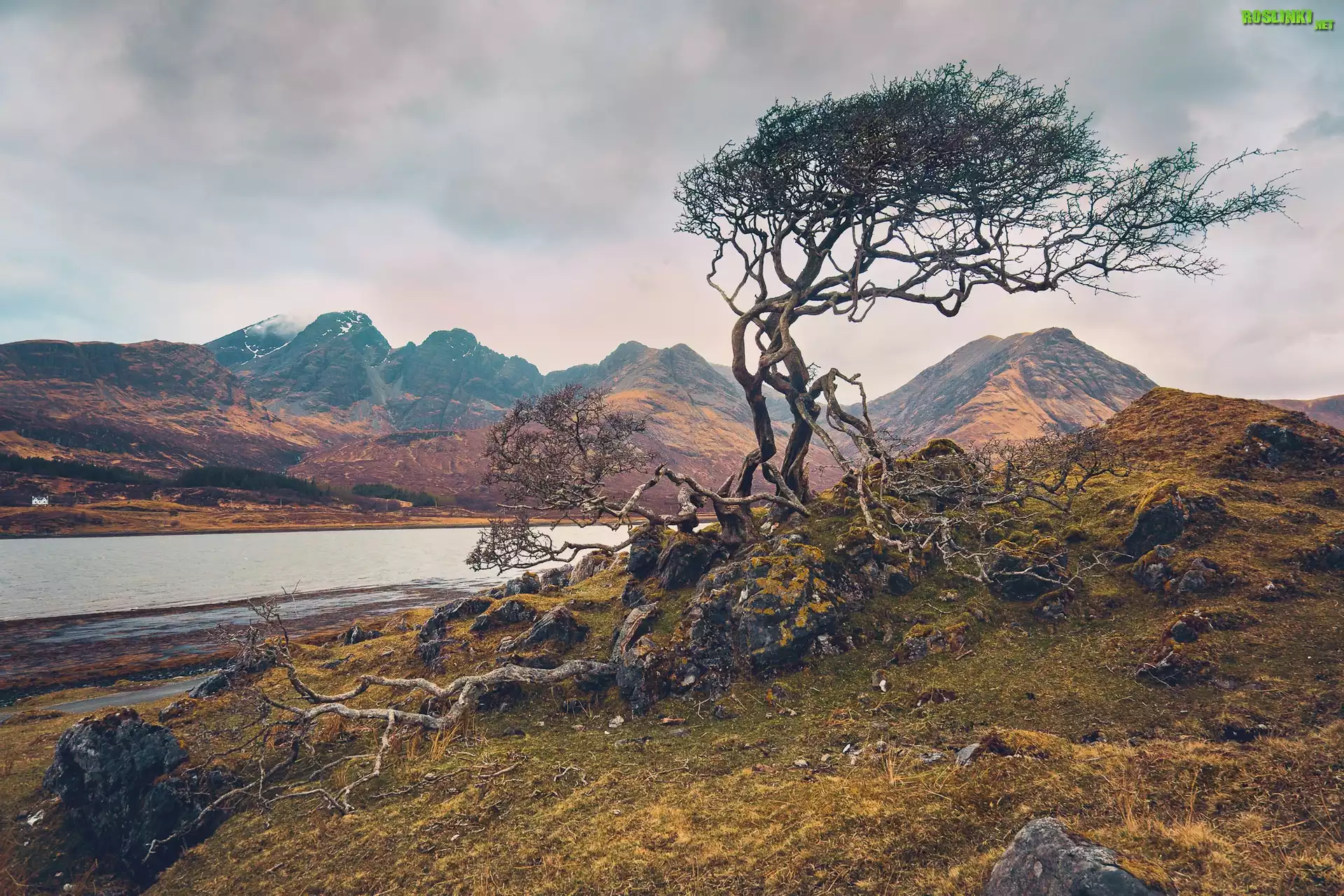 Rośliny: Góry, Drzewo, Kamienie, Skały, Chmury, Rzeka