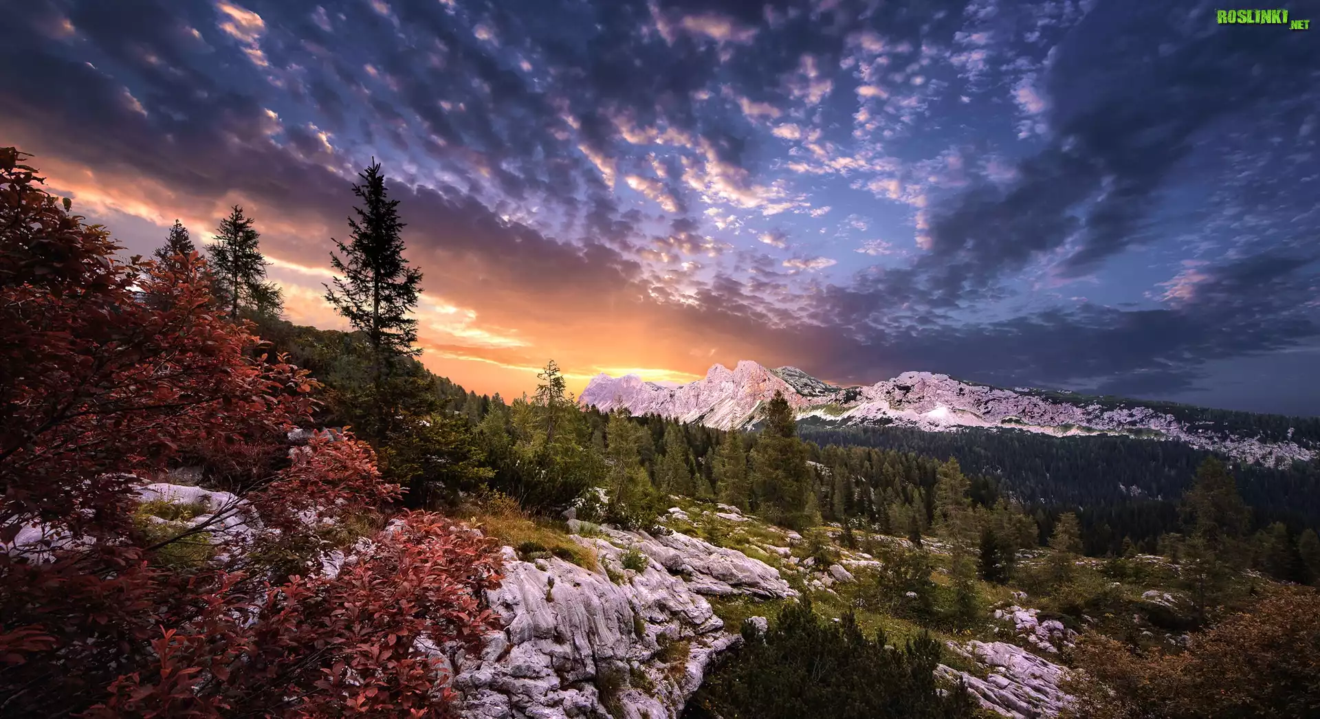Rośliny: Góry, Skały, Zachód słońca, Chmury, Drzewa