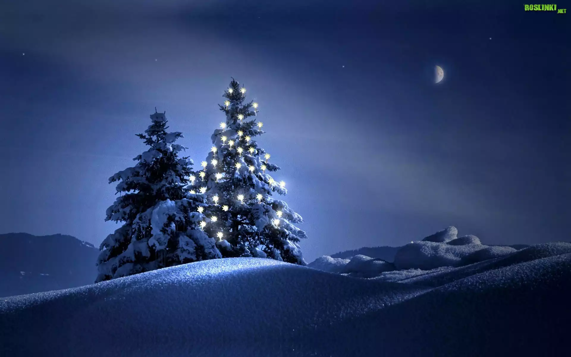 Rośliny: Góry, Noc, Oświetlona, Choinka, Zima