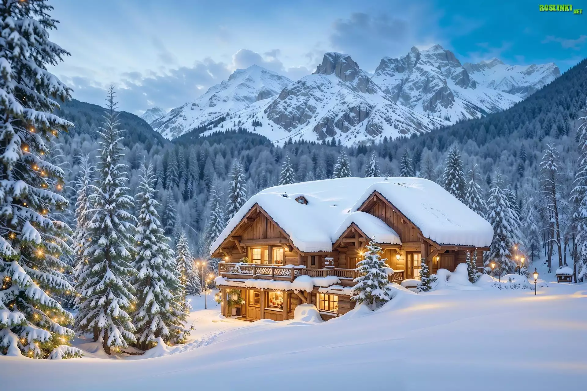 Rośliny: Zima, Oświetlony, Dom, Góry, Drzewa, Las, Grafika
