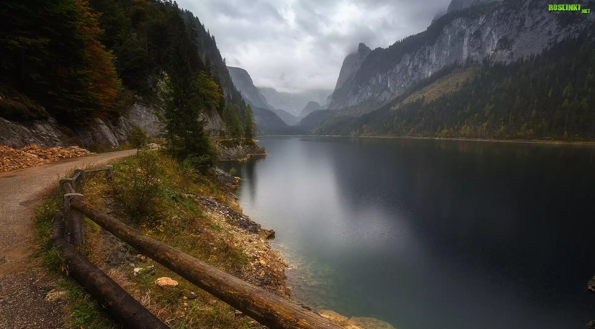 Rośliny: Góry, Rzeka, Droga, Drzewa, Ogrodzenie