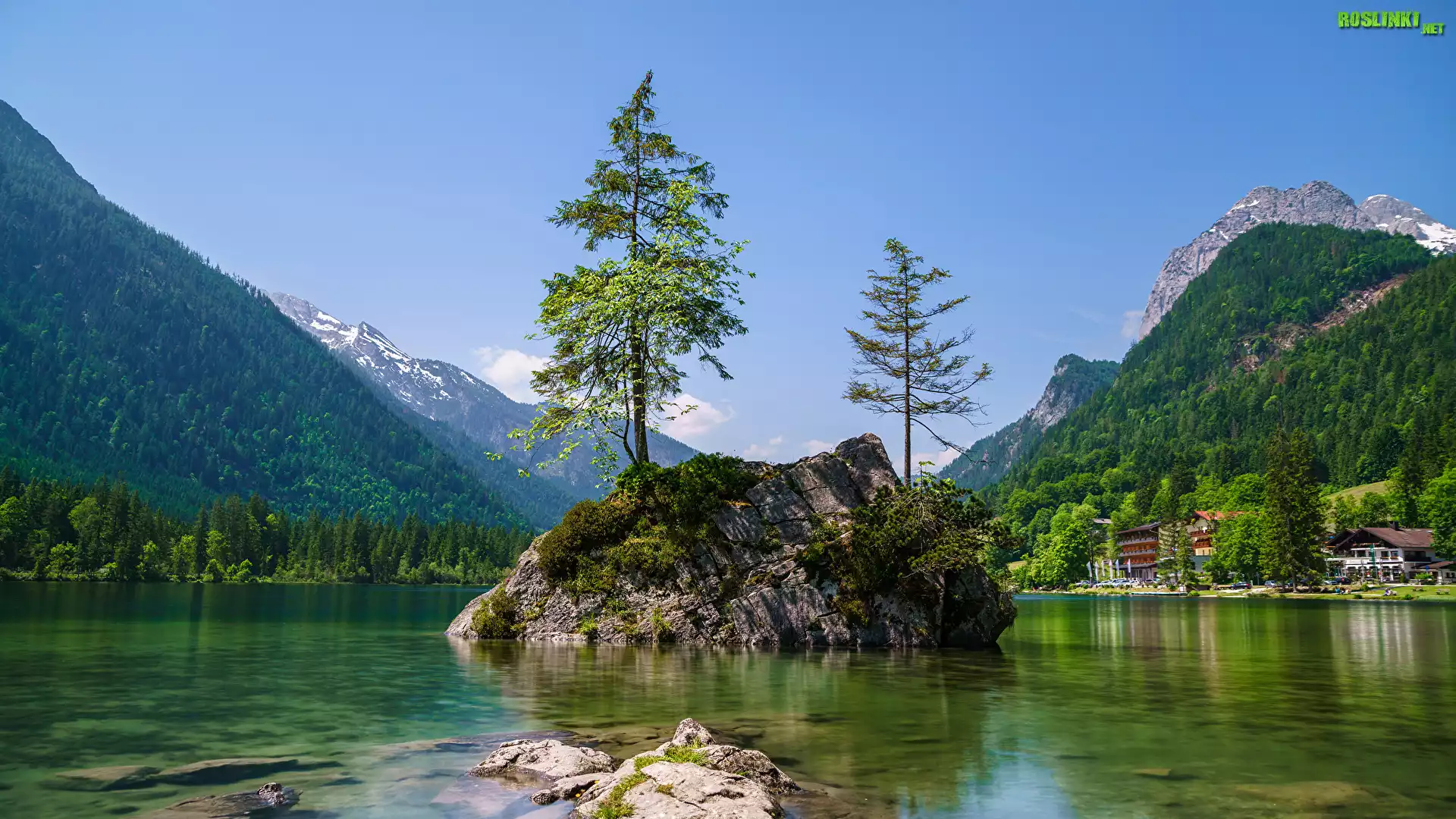Rośliny: Jezioro Hintersee, Góry Alpy, Drzewa, Skały, Kamienie, Gmina Berchtesgadener, Bawaria, Niemcy