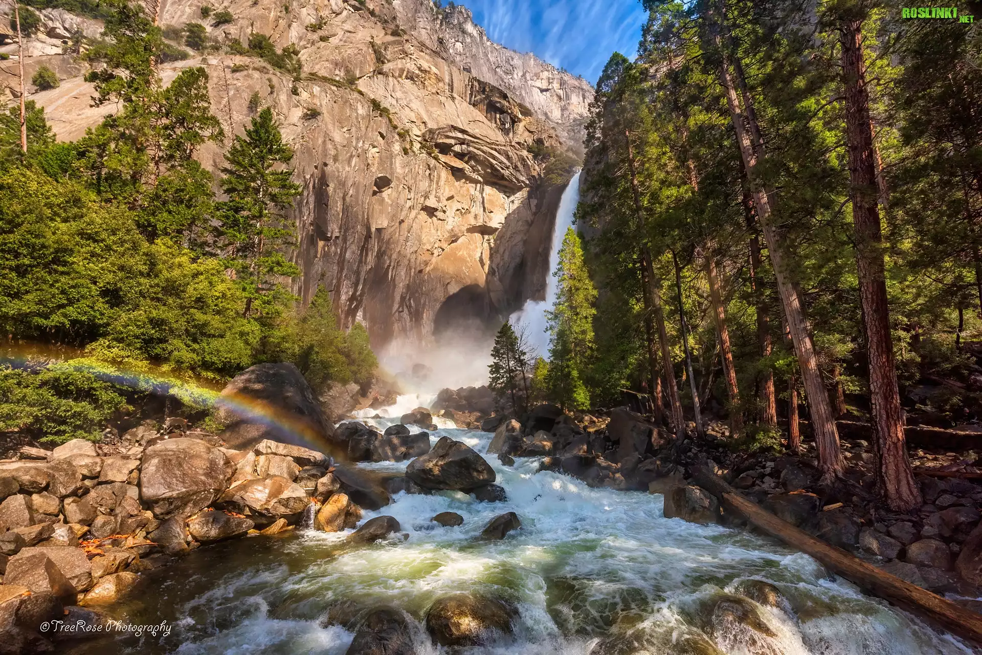 Rośliny: Stany Zjednoczone, Kalifornia, Park Narodowy Yosemite, Góry, Drzewa, Wodospad, Rzeka, Tęcza