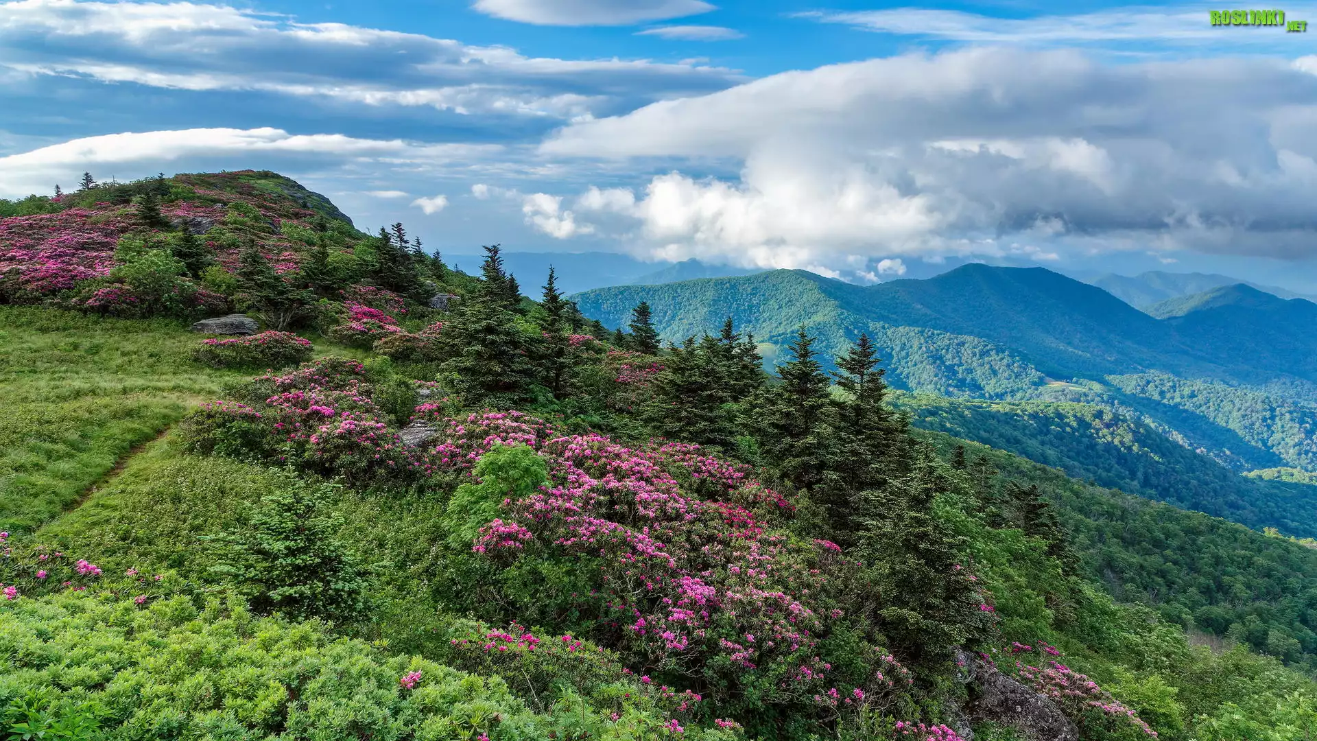 Rośliny: Góry, Zbocze, Kwiaty, Różaneczniki, Drzewa, Chmury