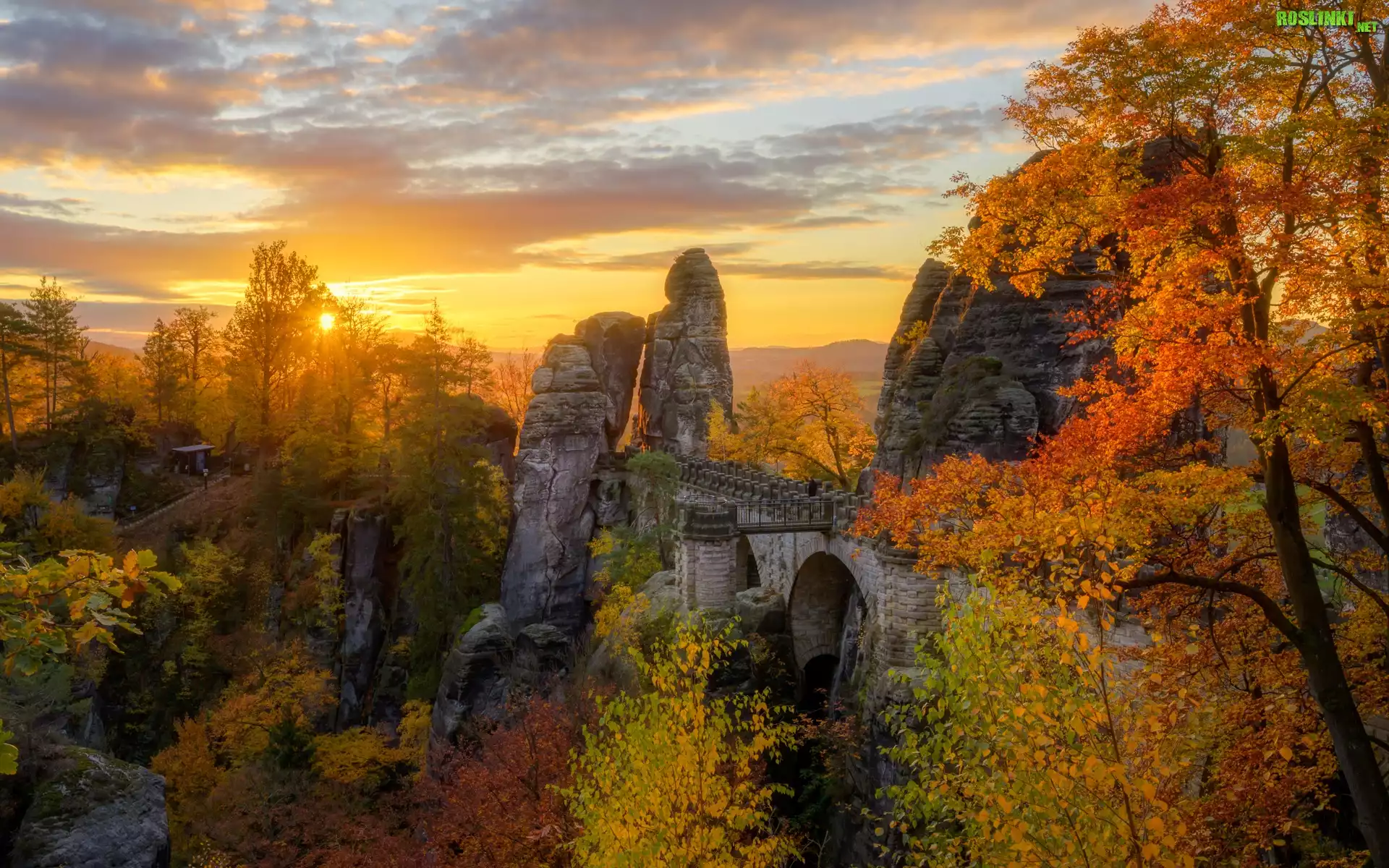 Niemcy, Saksonia, Park Narodowy Saskiej Szwajcarii, Góry Połabskie, Las, Drzewa, Jesień, Bastei, Skały, Zachód słońca, Chmury |
