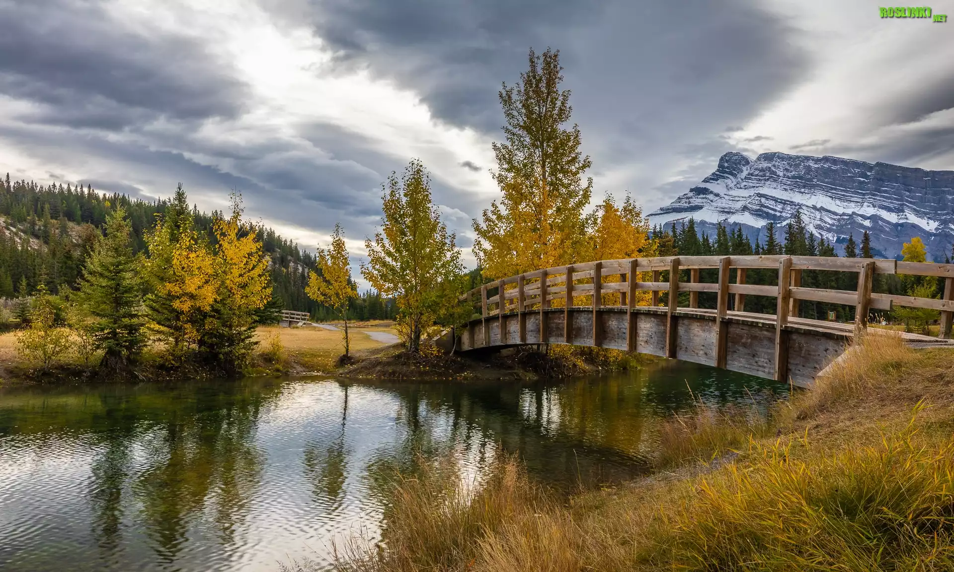 Rośliny: Góry, Rzeka, Mostek, Drzewa, Chmury