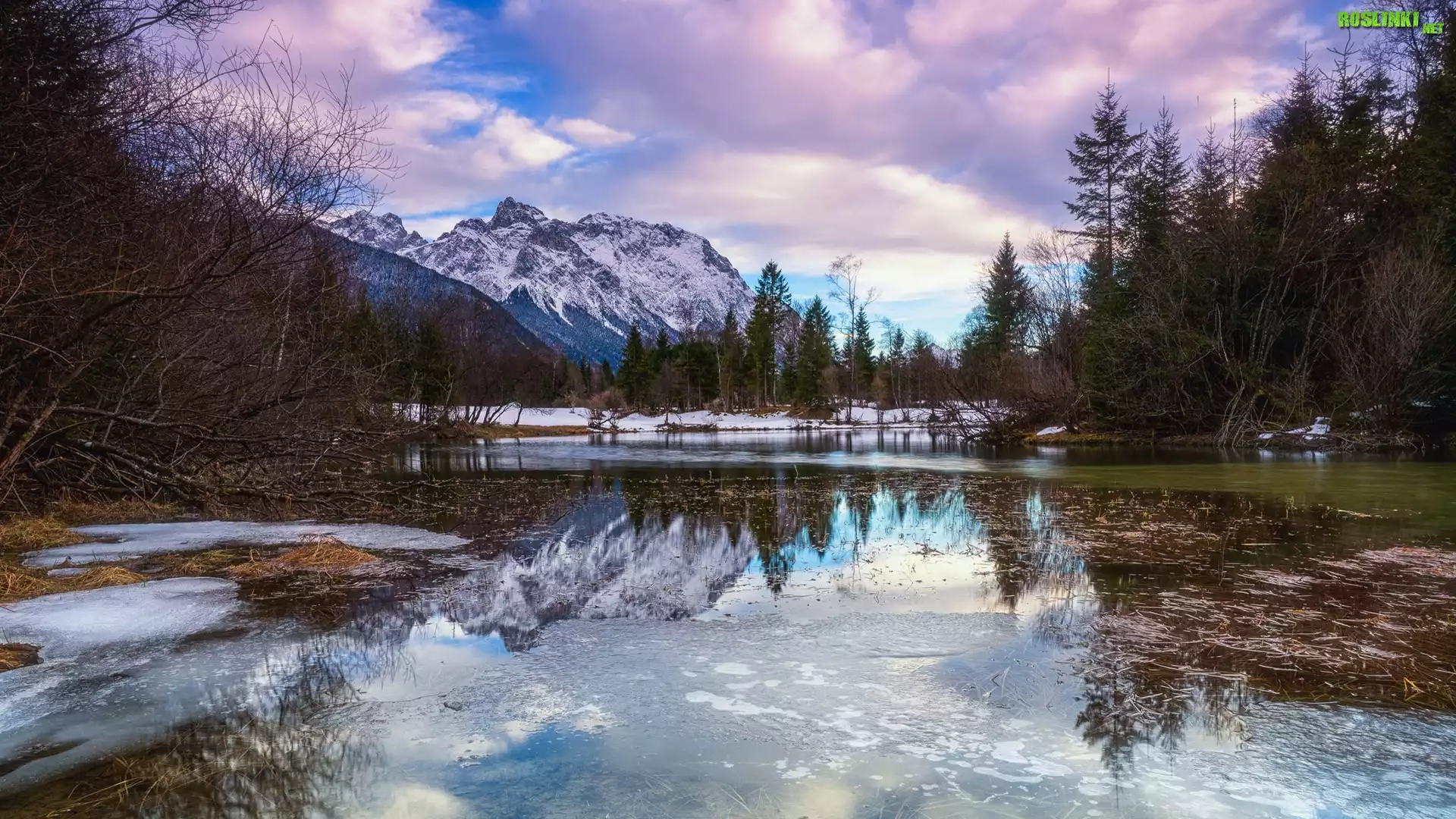Rośliny: Góry, Jezioro, Śnieg, Drzewa, Chmury