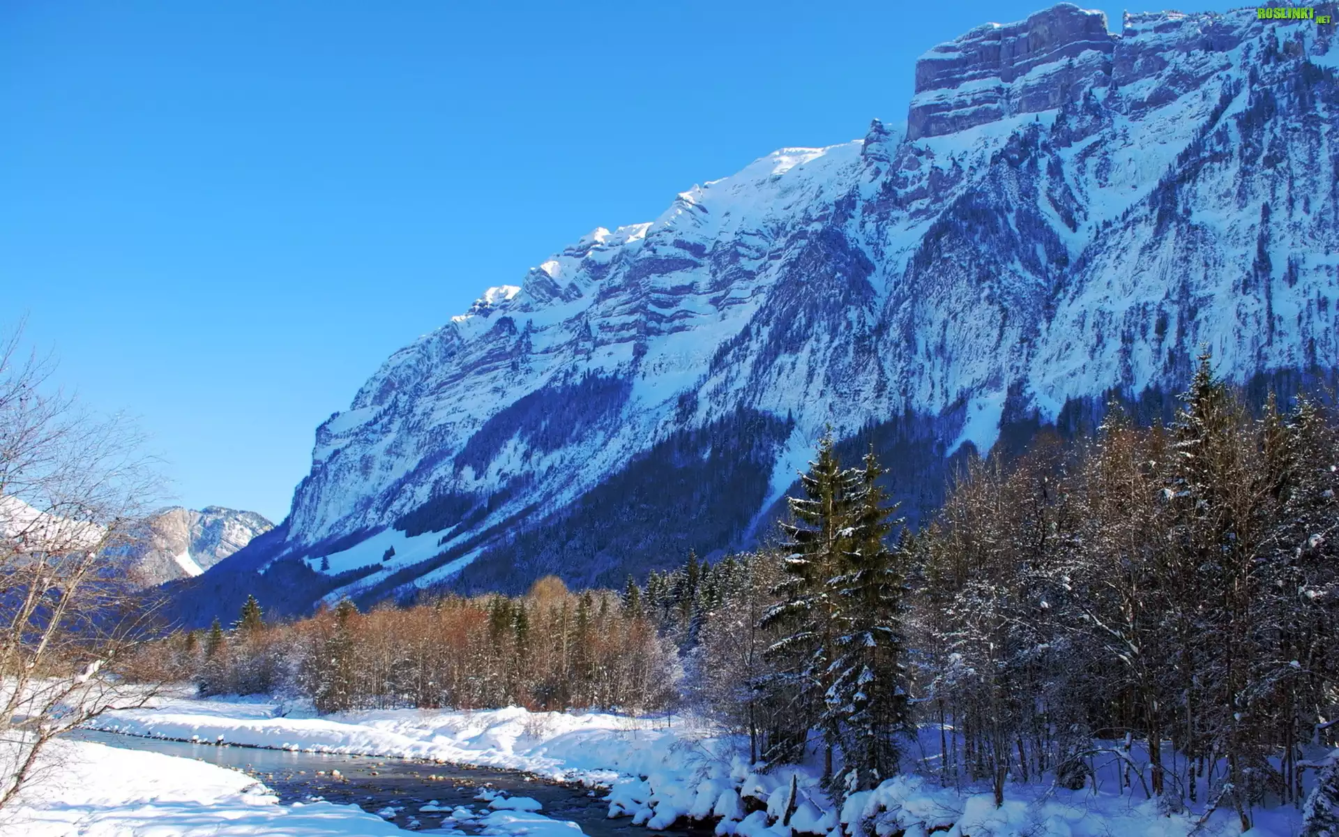Rośliny: Góry, Rzeka, Drzewa, Zima