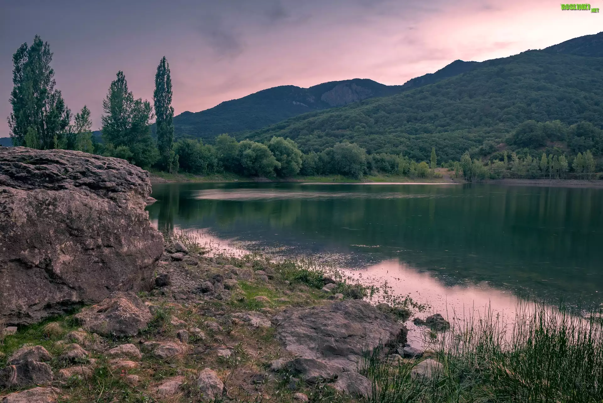 Rośliny: Góry, Jezioro, Skały, Drzewa, Poranek
