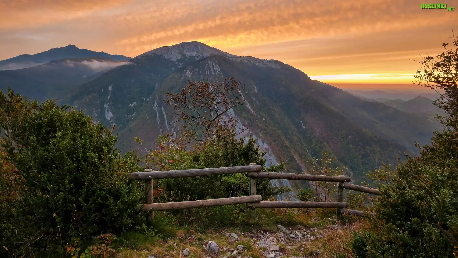 Rośliny: Góry, Zachód słońca, Drzewa, Ogrodzenie