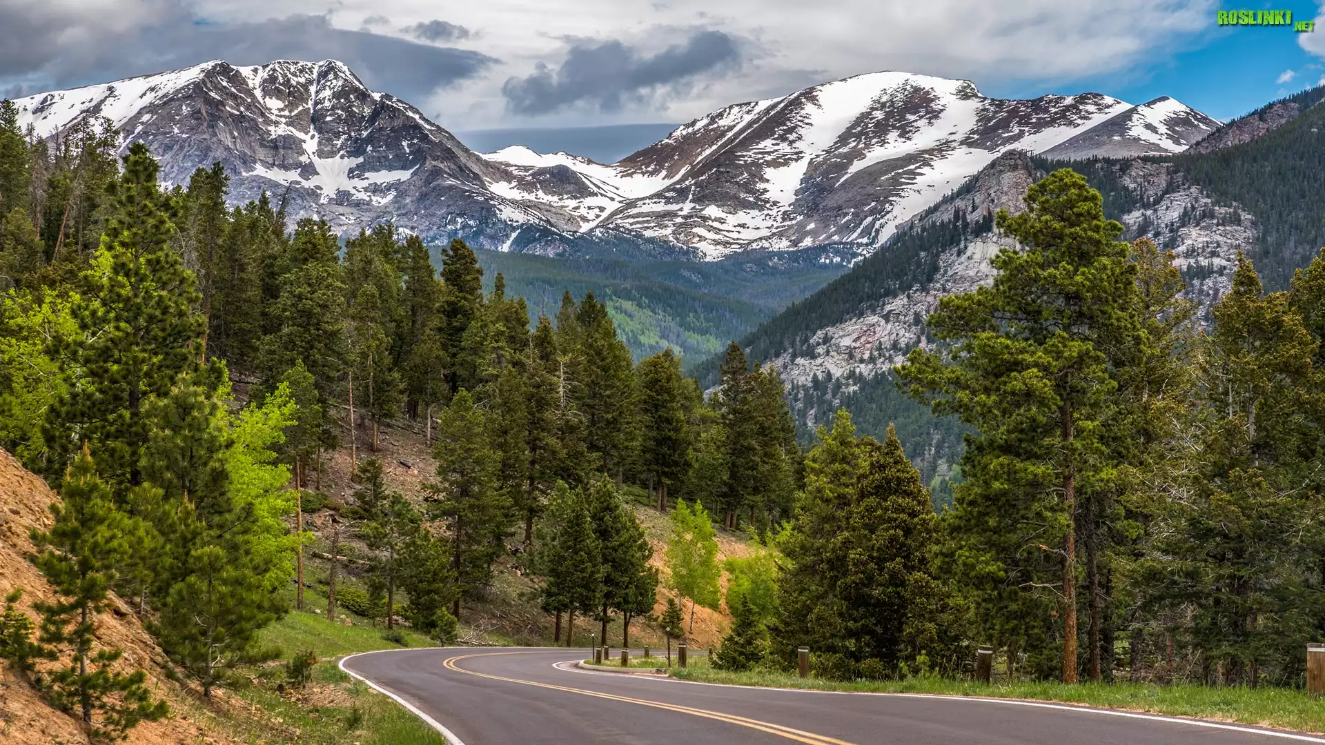 Rośliny: Góry, Ośnieżone, Szczyty, Droga, Drzewa, Chmury