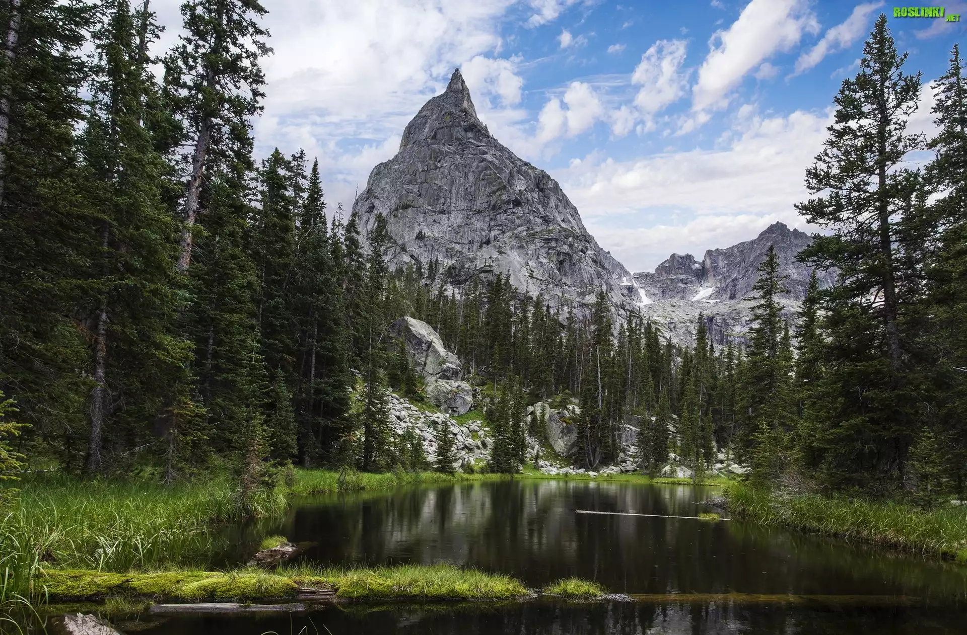 Góry, Szczyt Lone Eagle Peak, Indian Peaks Wilderness, Stan Kolorado, Stany Zjednoczone, Jezioro, Drzewa, Chmury |