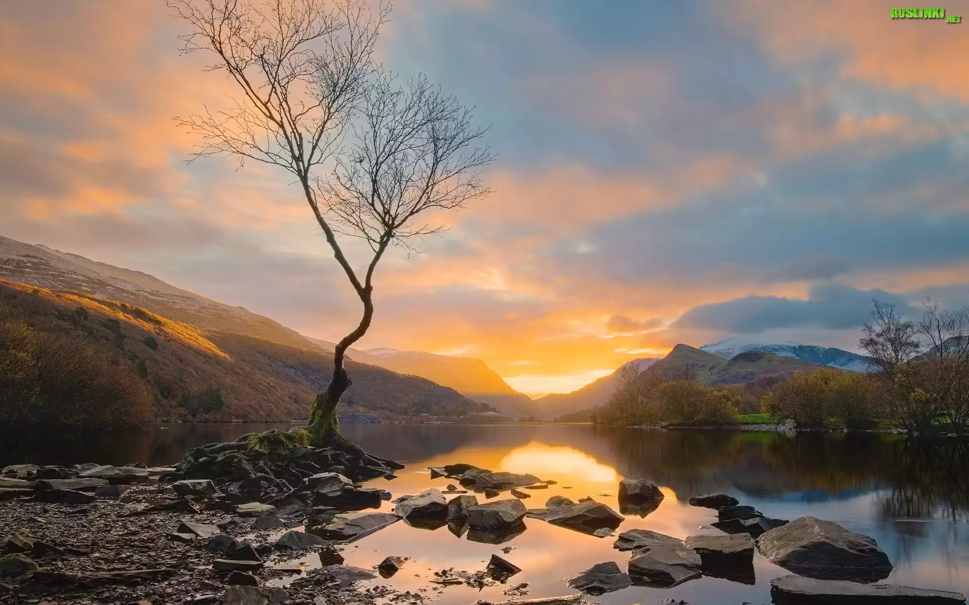 Rośliny: Walia, Jezioro, Llyn Padarn, Kamienie, Snowdonia, Góry, Drzewo, Zachód słońca, Chmury