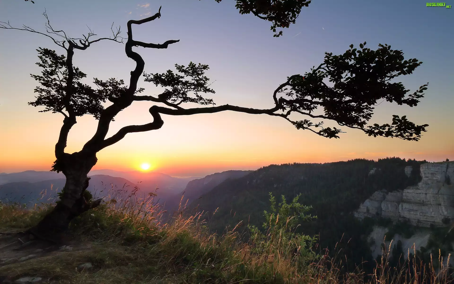 Rośliny: Góry, Wschód słońca, Drzewo, Trawa
