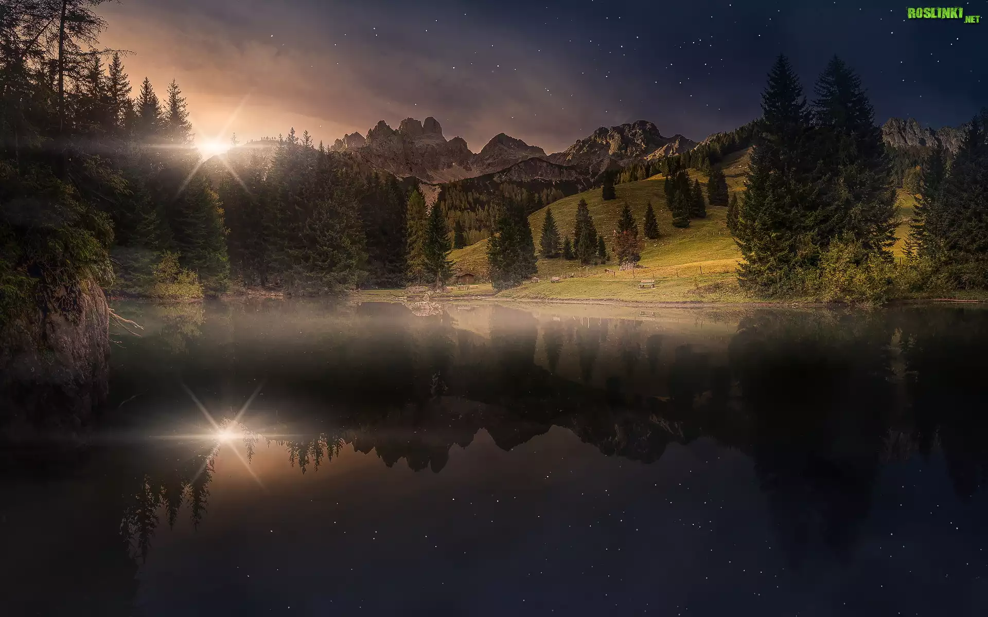 Góry Gosaukamm, Północne Alpy Wapienne, Drzewa, Zmierzch, Promienie słońca, Gwiazdy, Jezioro Almsee, Odbicie, Filzmoos, Austria |