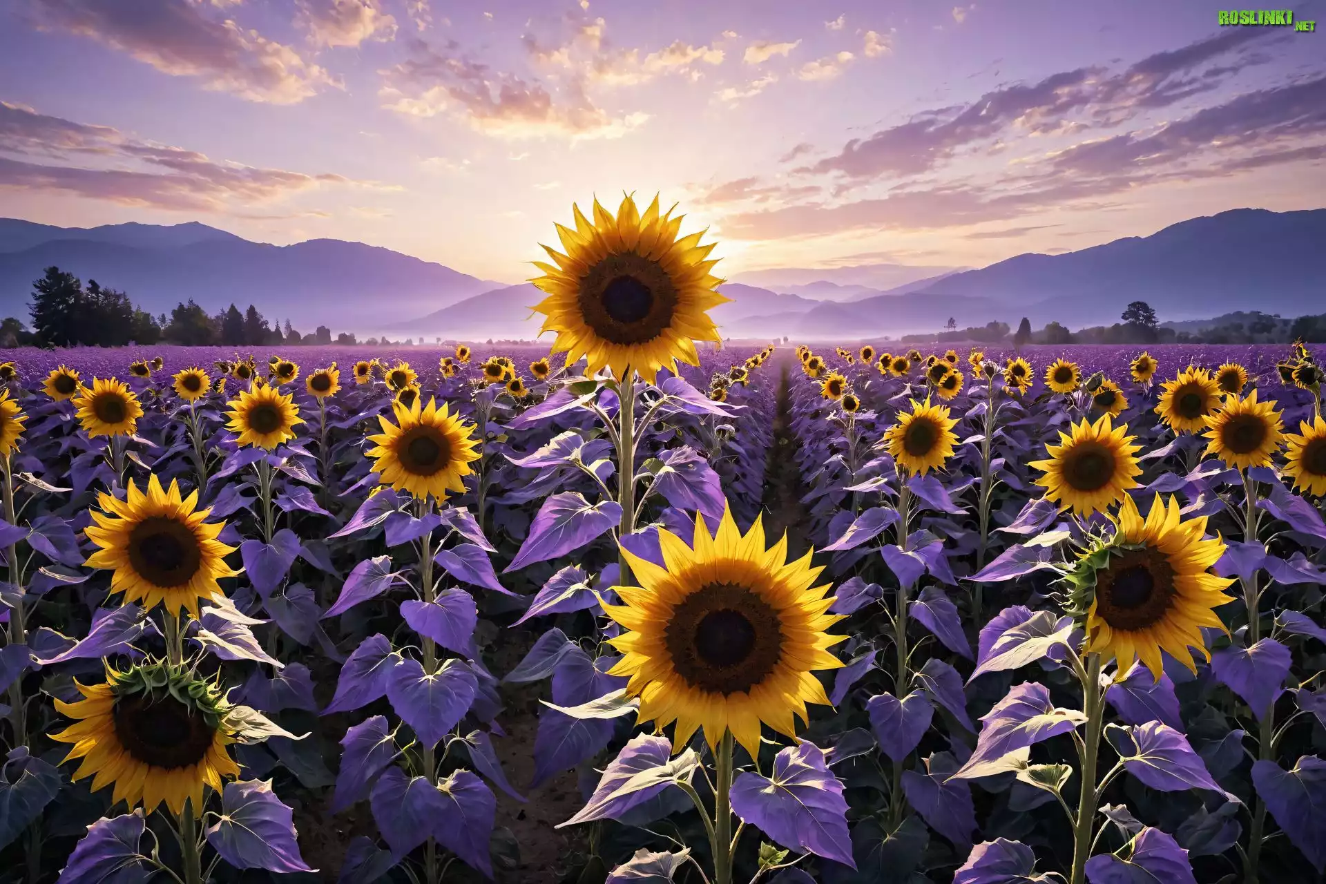 Rośliny: Pole, Słoneczniki, Drzewa, Góry, Niebo, Grafika