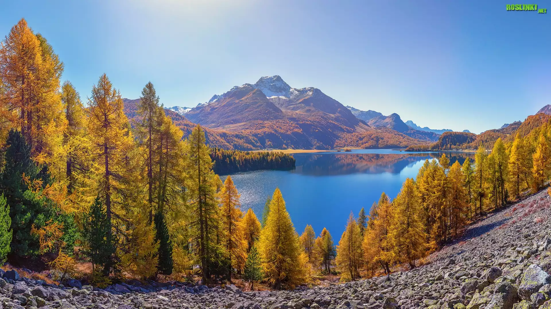 Góry Alpy, Jesień, Drzewa, Dolina Engadyna, Jezioro Silsersee, Szczyt Piz da la Margna, Kanton Gryzonia, Szwajcaria |