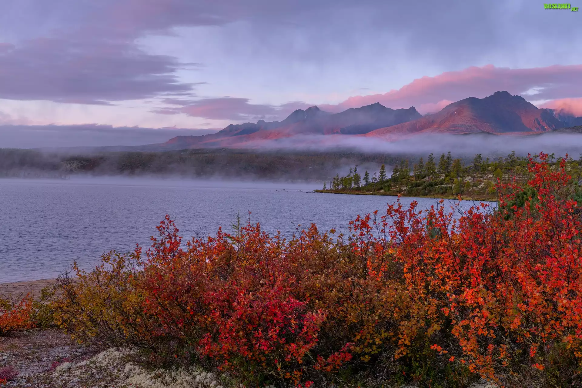 Góry Kołymskie, Jezioro Jack London, Drzewa, Czerwone, Krzewy, Mgła, Kołyma, Obwód magadański, Rosja |