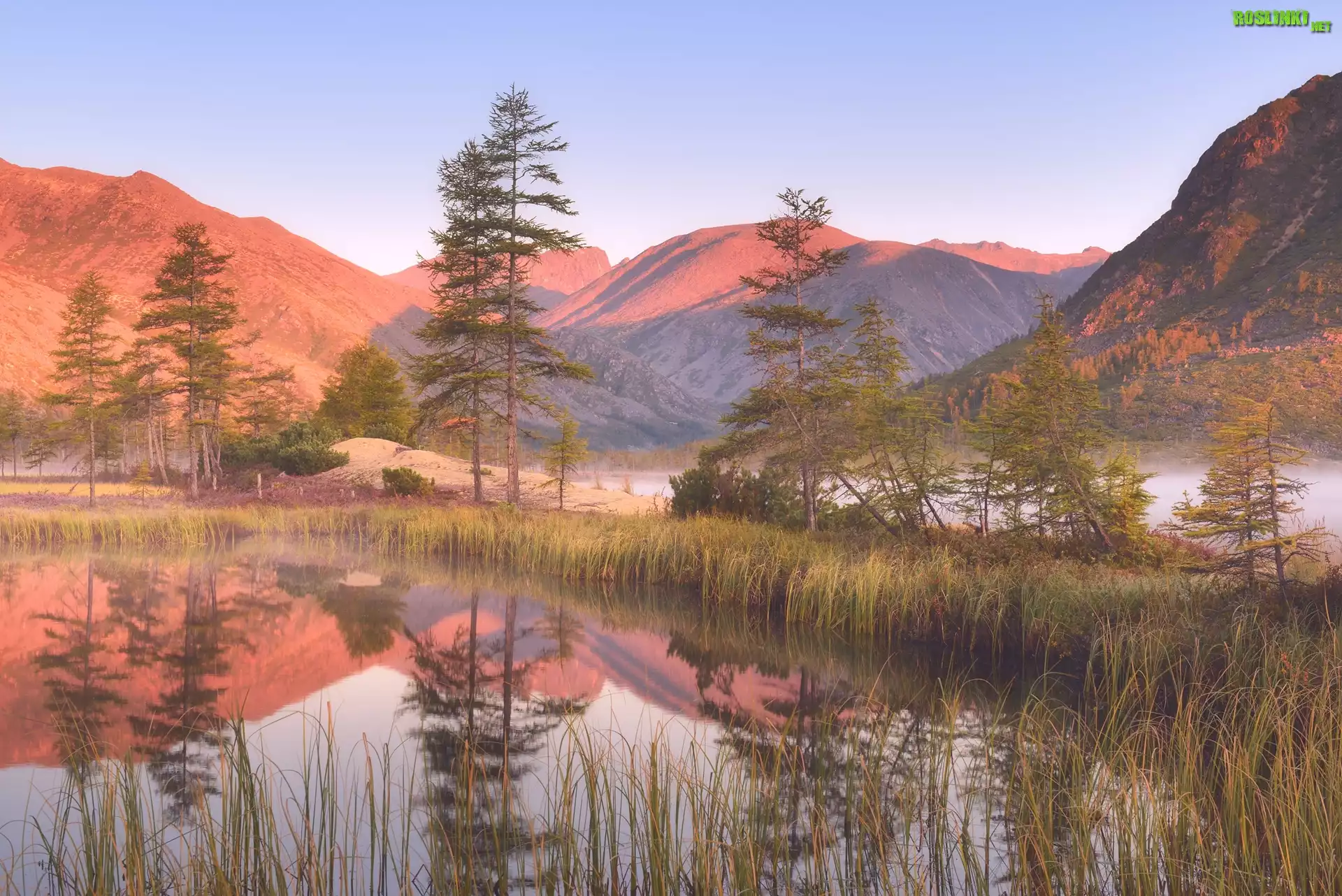 Góry Kołymskie, Jezioro Jack London, Kołyma, Obwód magadański, Rosja, Mgła, Drzewa, Trawy, Odbicie |