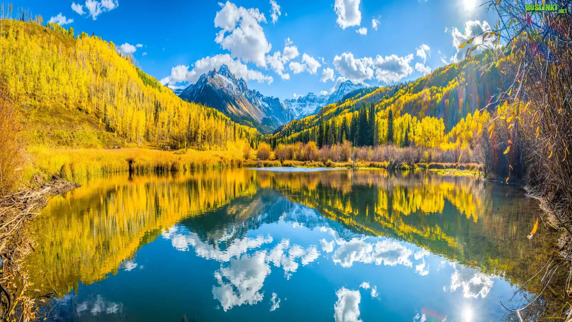 Park Narodowy Glacier, Góry, Jezioro, Niebo, Odbicie, Drzewa, Obłoki, Jesień, Kolorado, Stany Zjednoczone |