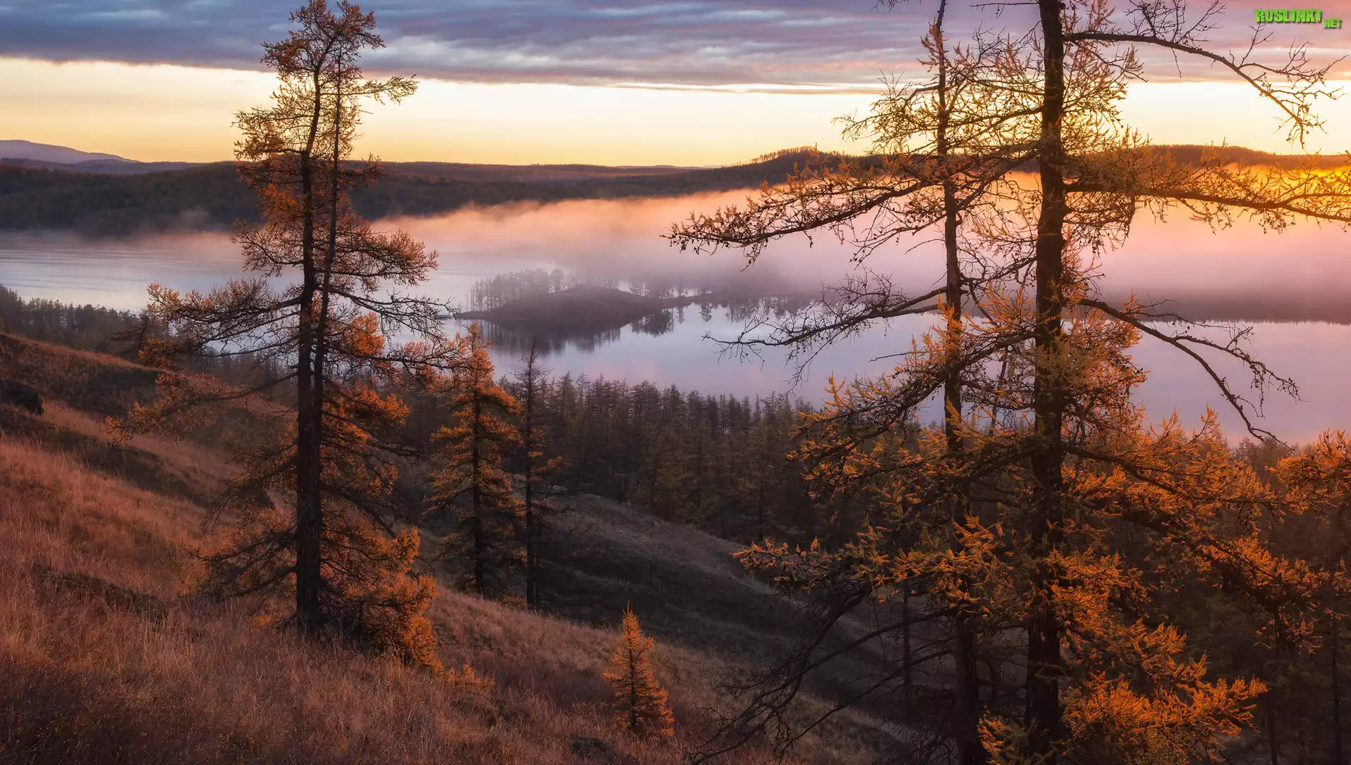 Rośliny: Jesień, Góry, Jezioro, Drzewa, Trawy, Chmury, Mgła