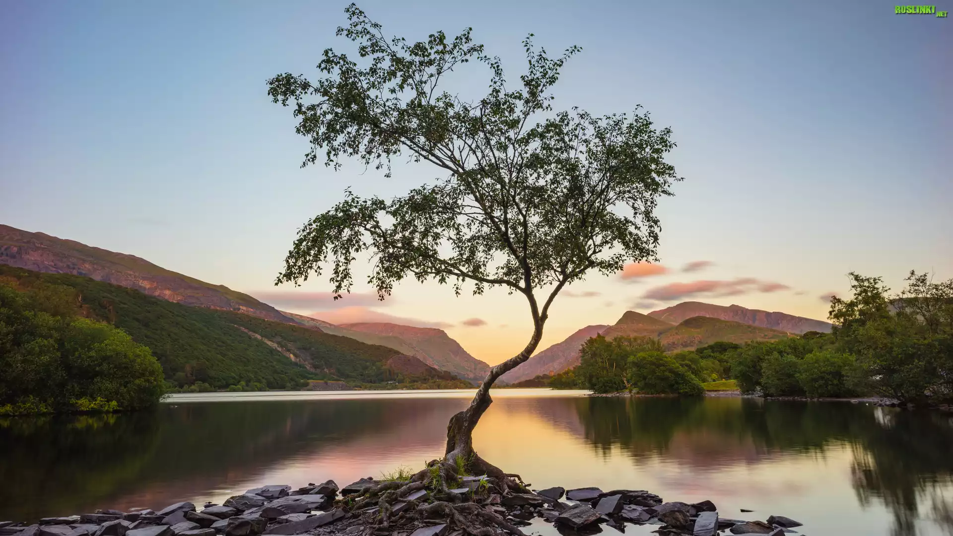 Rośliny: Jezioro Llyn Padarn, Drzewo, Kamienie, Góry, Park Narodowy Snowdonia, Walia, Wielka Brytania