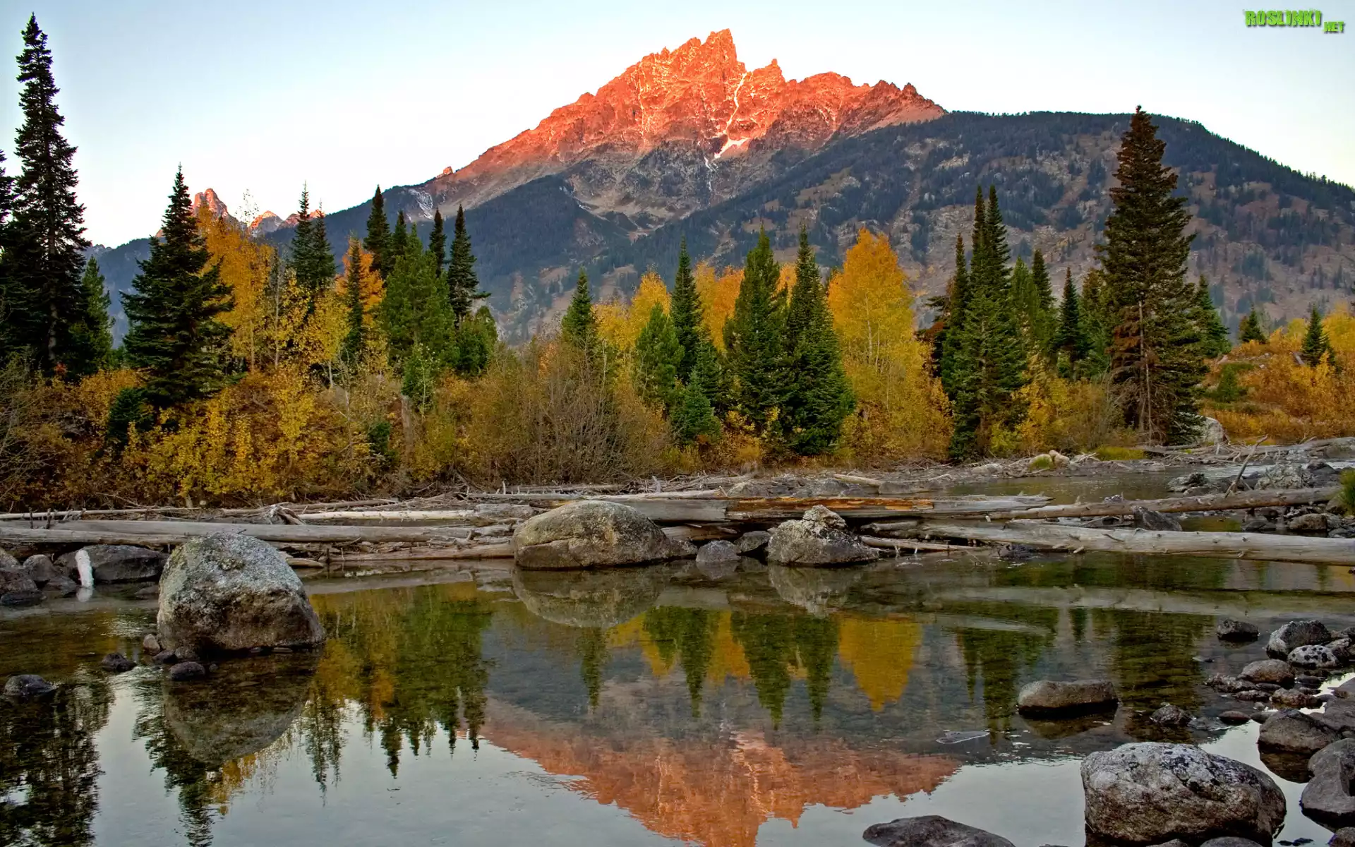 Rośliny: Drzewa, Góry, Niebo, Zachód słońca, Jezioro, Odbicie, Kamienie