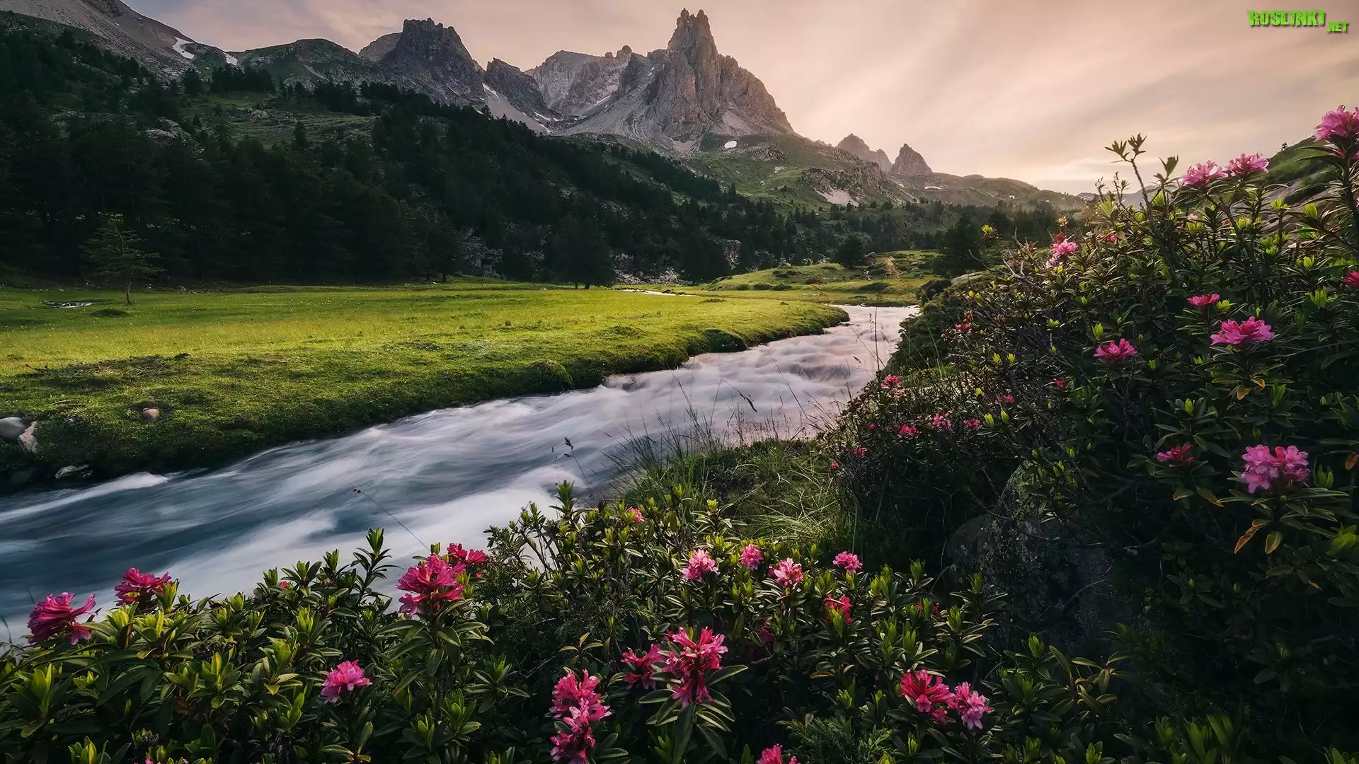 Rośliny: Góry, Rzeka, Drzewa, Kwiaty, Różaneczniki