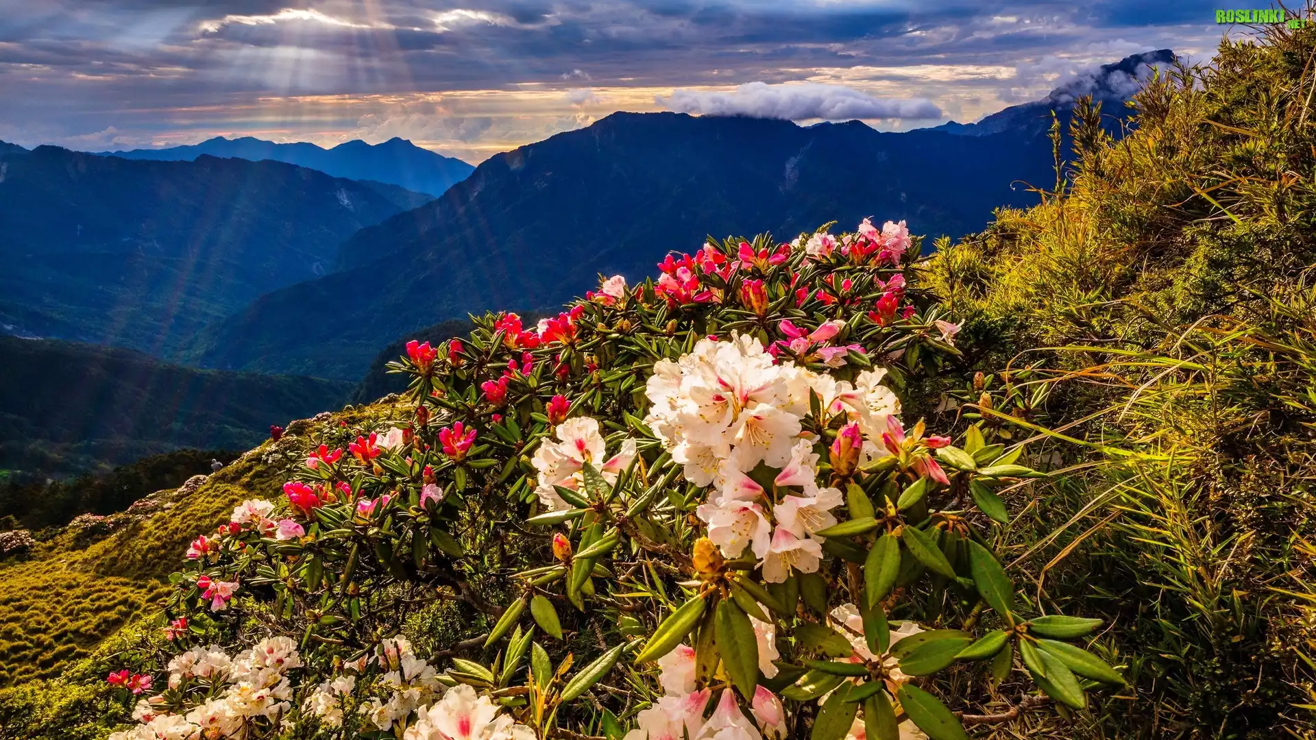 Rośliny: Góry, Promienie słońca, Poranek, Kwiaty, Różaneczniki