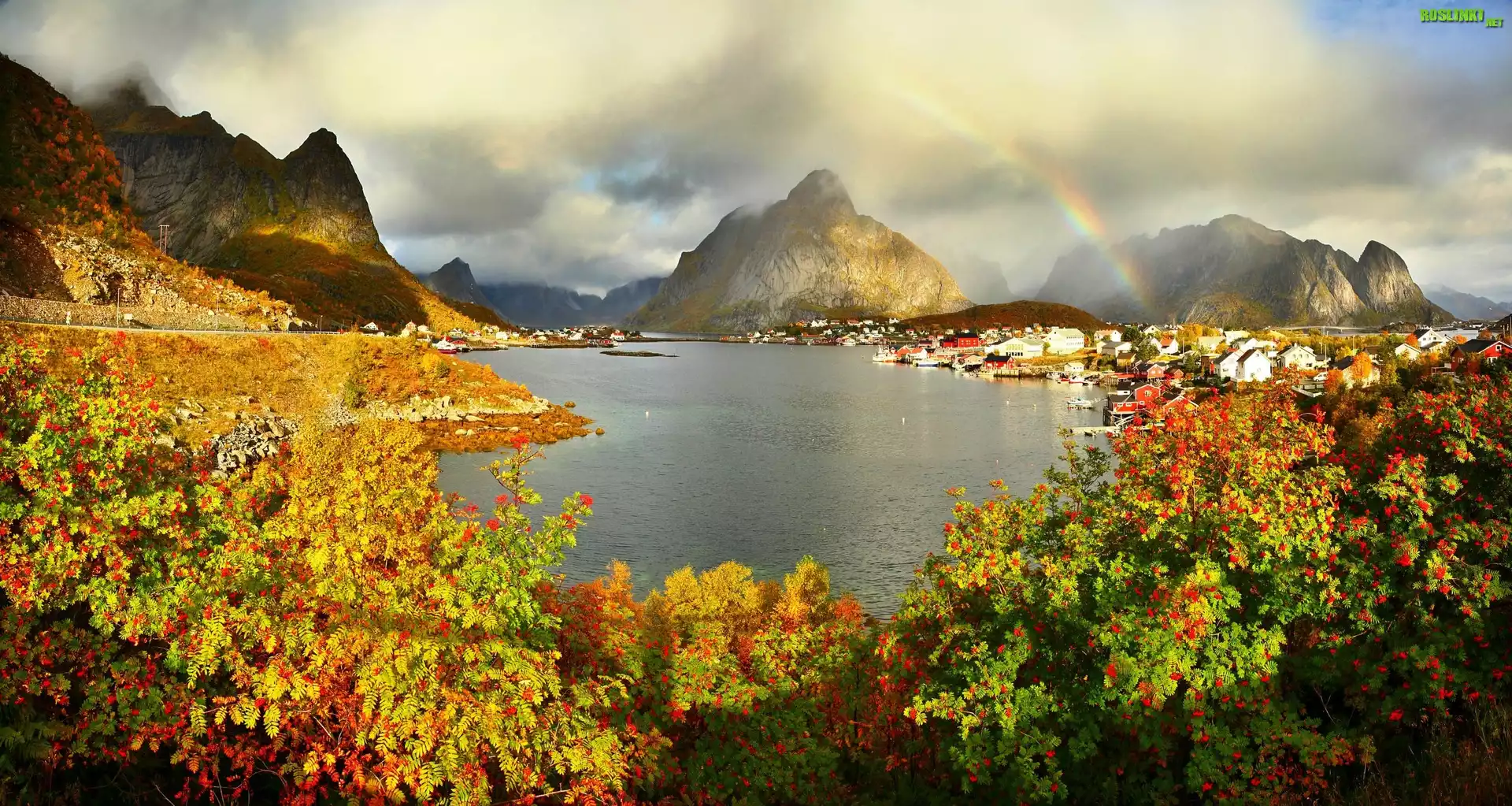 Rośliny: Góry, Jezioro, Tęcza, Kwitnące, Krzewy