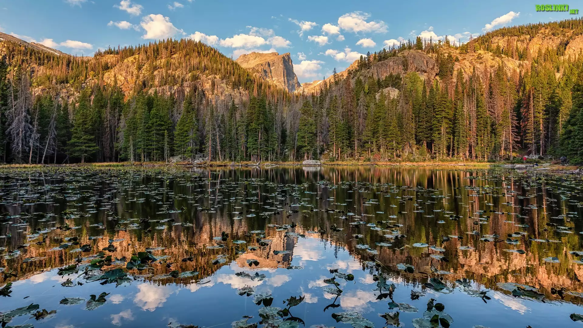 Góry, Jezioro, Nymph Lake, Drzewa, Park Narodowy Gór Skalistych, Odbicie, Kolorado, Stany Zjednoczone |