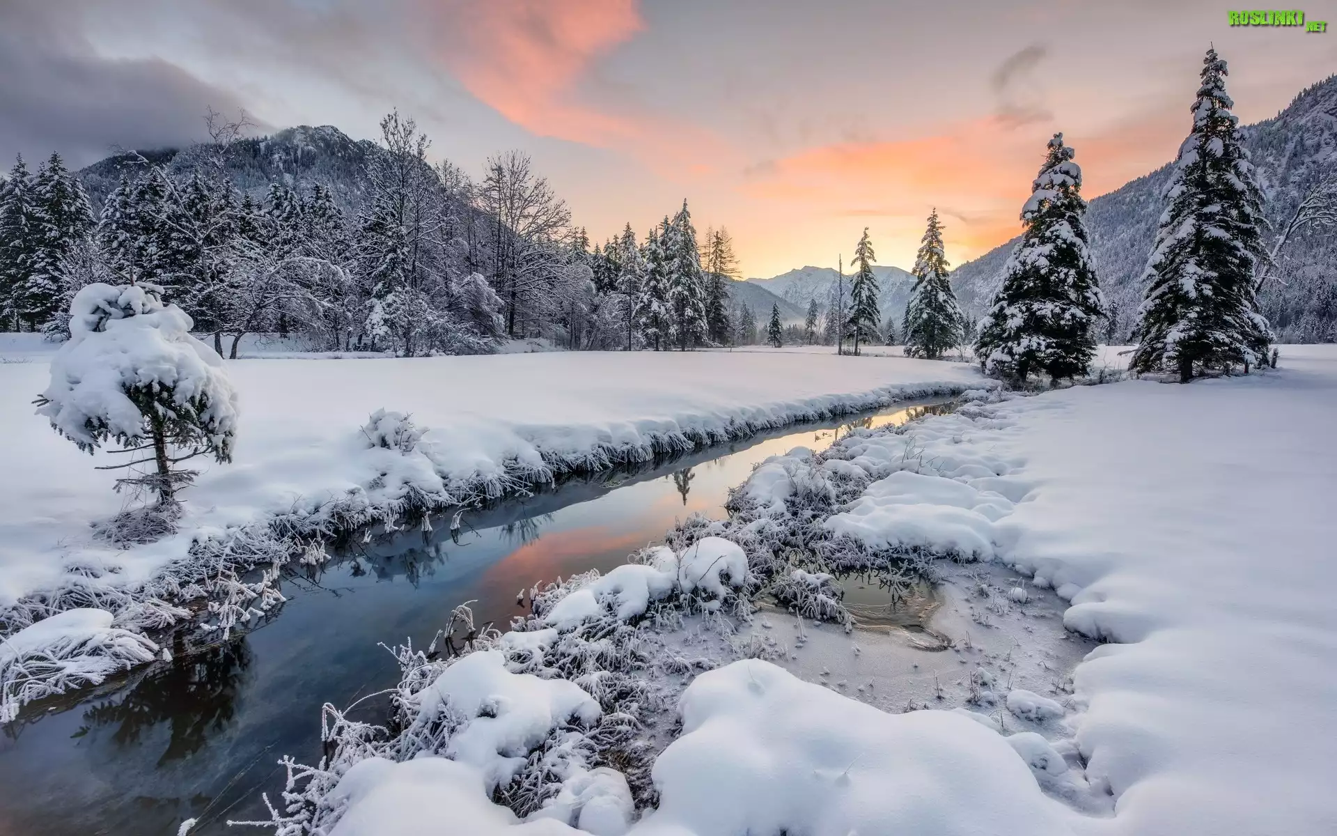 Rośliny: Zima, Góry, Las, Drzewa, Potok