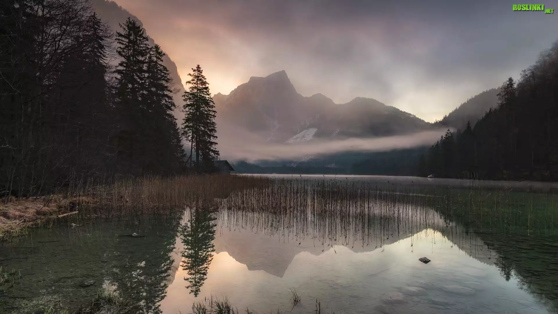 Rośliny: Góry, Jezioro, Leopoldsteinersee, Drzewa, Mgła, Austria