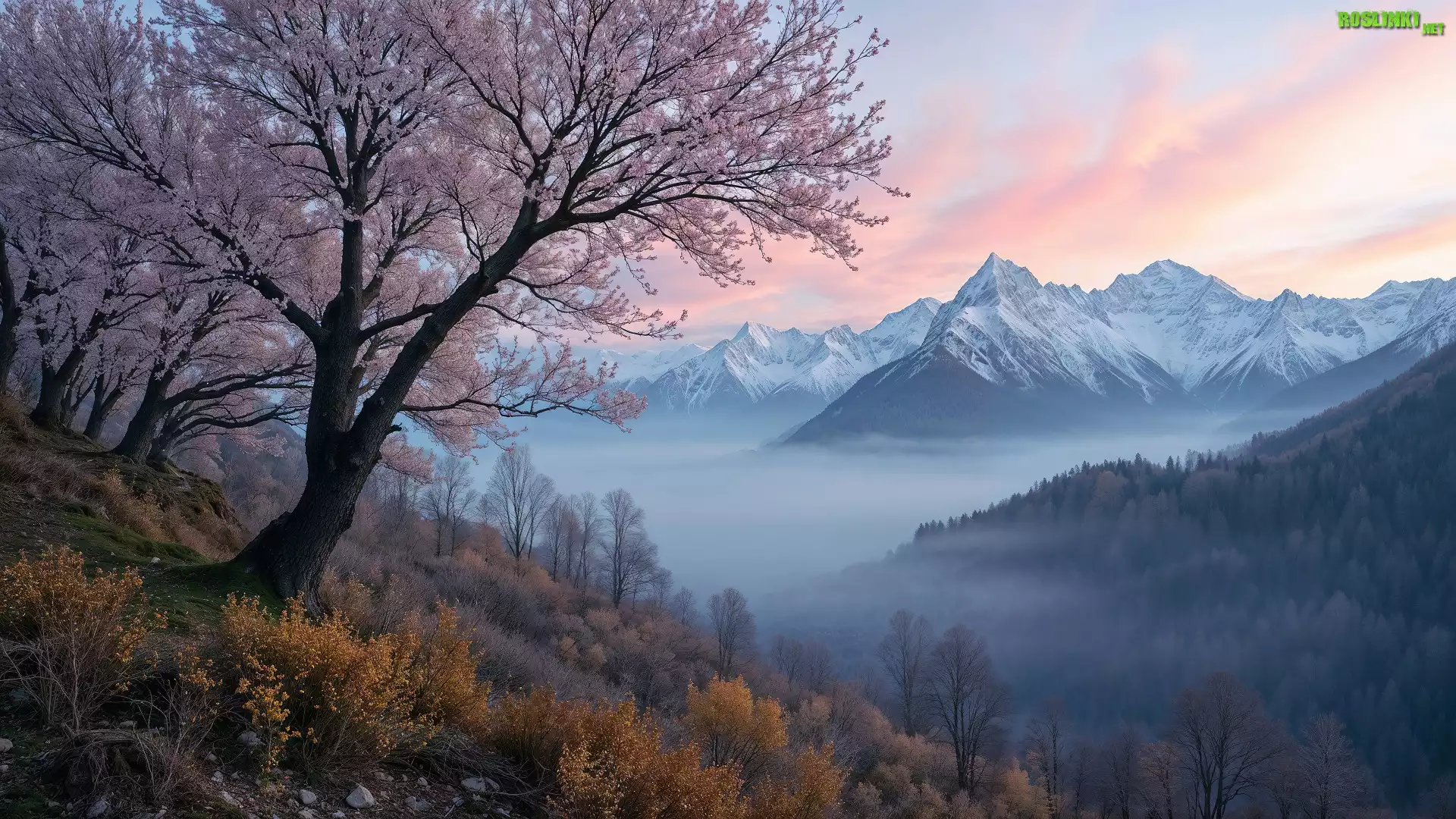 Rośliny: Drzewa, Góry, Mgła, Pożółkłe, Rośliny