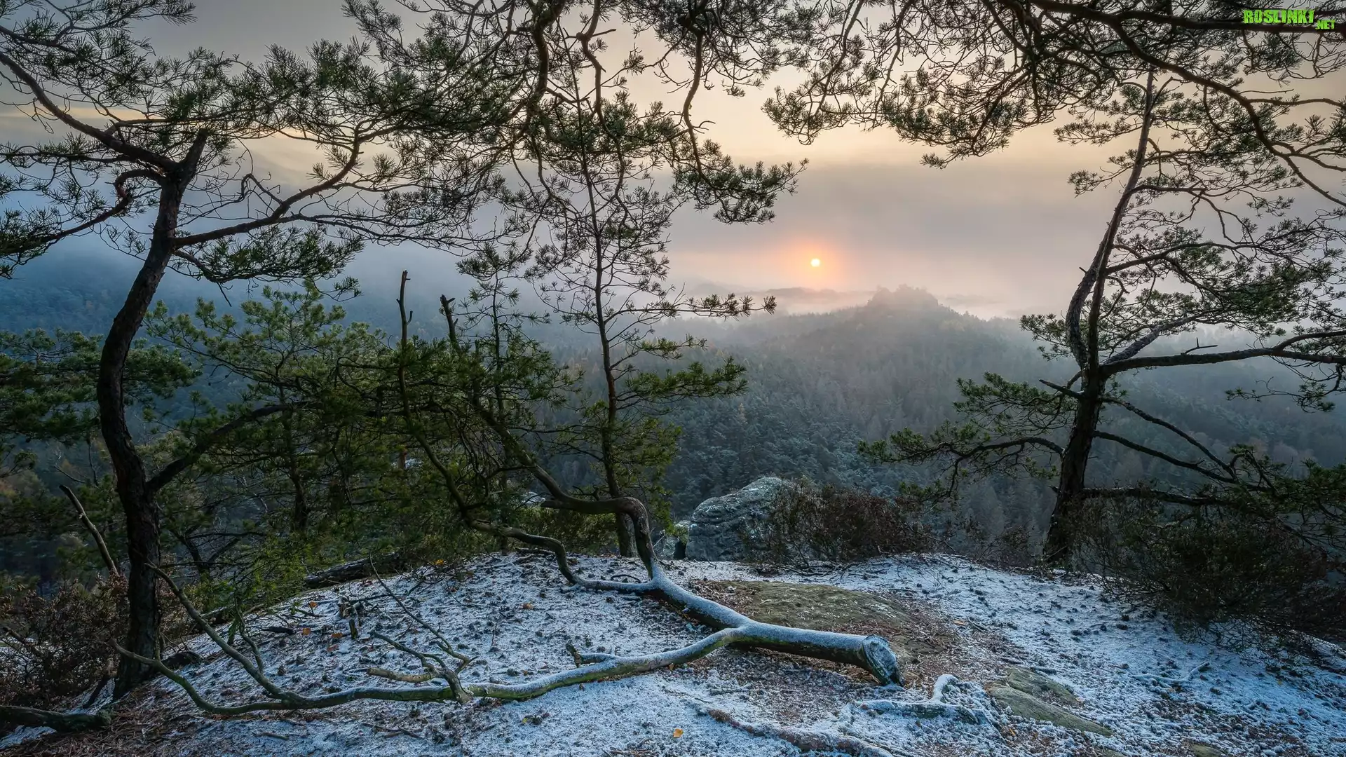 Wschód słońca, Mgła, Góry, Drzewa, Śnieg, Skały