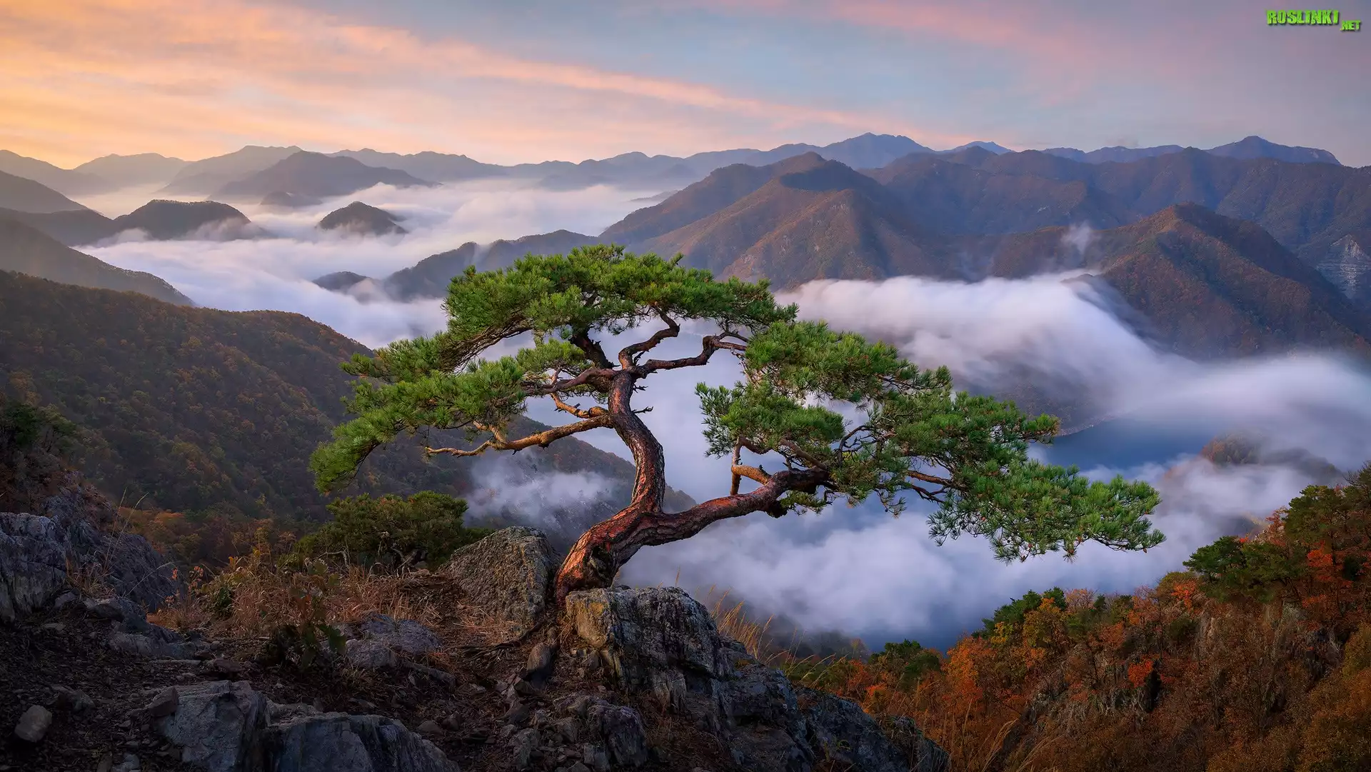 Rośliny: Góry, Skały, Sosna, Mgła, Poranek