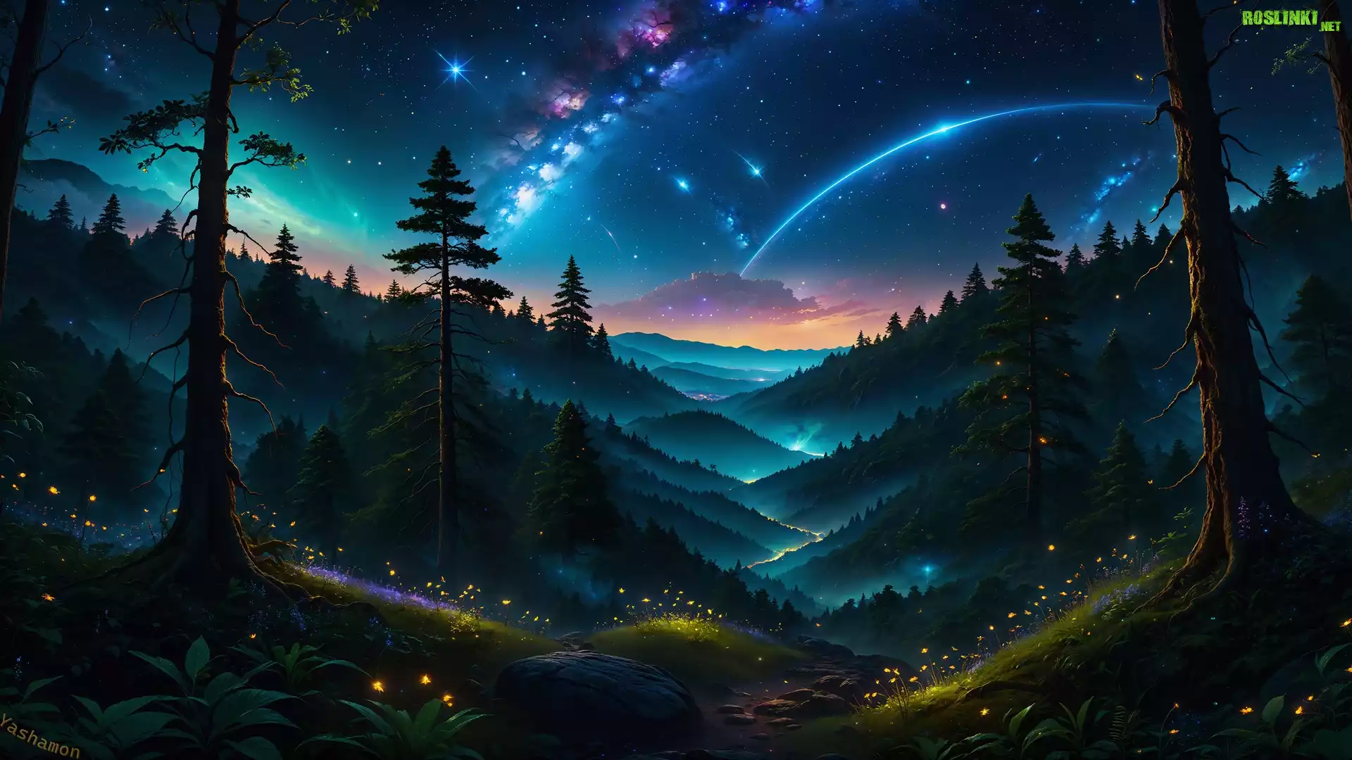 Rośliny: Góry, Dolina, Las, Drzewa, Noc, Gwiazdy, Niebo, Droga Mleczna, Grafika